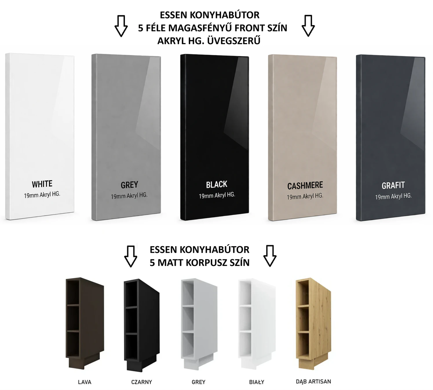 A gyártói oldalon a frontszínek közül a fehér, fekete, grafit és grey egyértelműen megjelenik, a korpuszoknál pedig white, grey, lava, oak artisan és black szerepelnek. A te csatolt anyagaid alapján az ESSEN kommunikációjában nálad öt frontszín és öt korpuszszín jelenik meg, ami kifejezetten jól használható webshopos kategóriaszövegben és inspirációs anyagokban is. A korpuszválaszték a gyártói oldalon is öt opcióból áll: white, grey, lava, oak artisan és czarny. Ez különösen fontos, mert a korpusz színe nem csak belül számít, hanem nyitott polcos részeknél, oldalfalakon, záróelemeknél és az egész összeállítás összhatásánál is sokat ad hozzá a kész látványhoz.