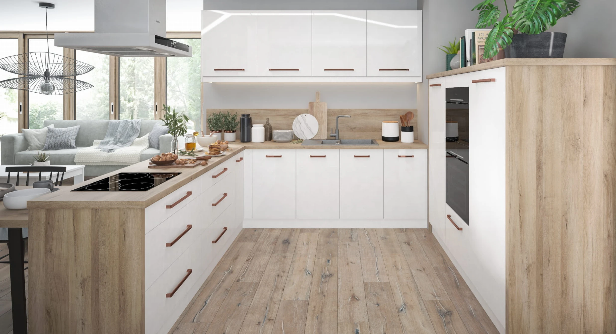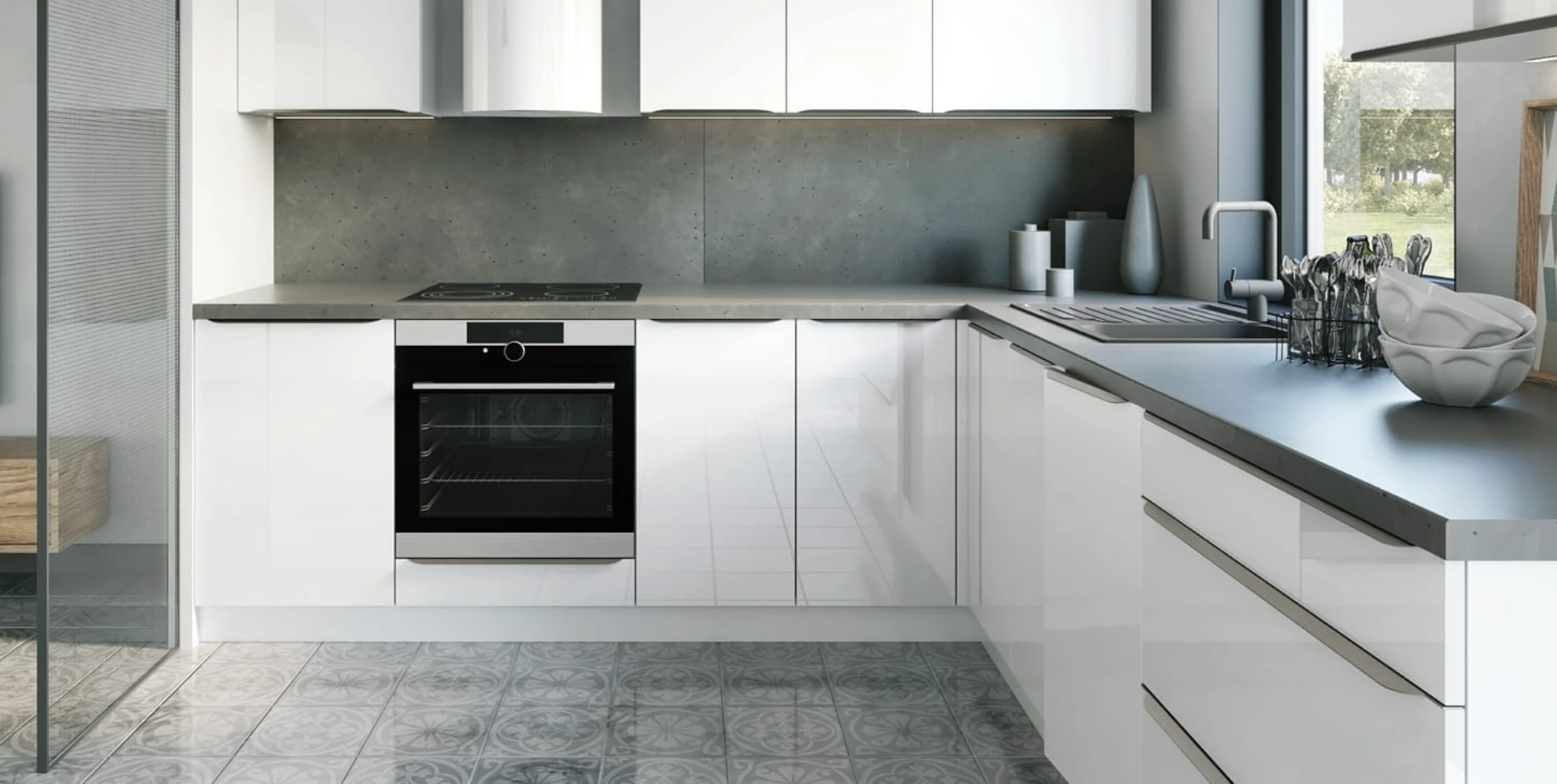 A fehér és világosabb magasfényű frontok egyik legnagyobb előnye, hogy segítenek világosabbnak és nagyobbnak láttatni a helyiséget. Ezért egy jól megtervezett elemes konyhabútor fehér ESSEN fronttal akár kisebb lakásokban is nagyon jól működhet.