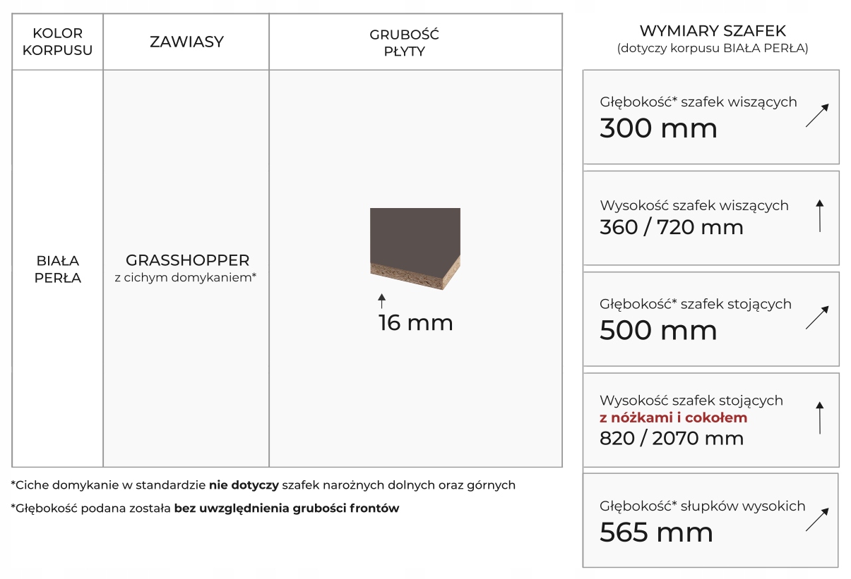 FEHÉR-BIALY PERLA 16mm vastag faforgácslap ABS élzárással és csillapított kivetőpántokkal (kivéve a fiókos és sarok szekrények). A korpusz szerelékcsomagja minden fogantyús elemnél tartalmazza a (160 mm furattávolságú, U2 típusú) fém fogantyút is, valamint a lábazati takarólécet, melynek színe a korpuszéval megegyező.