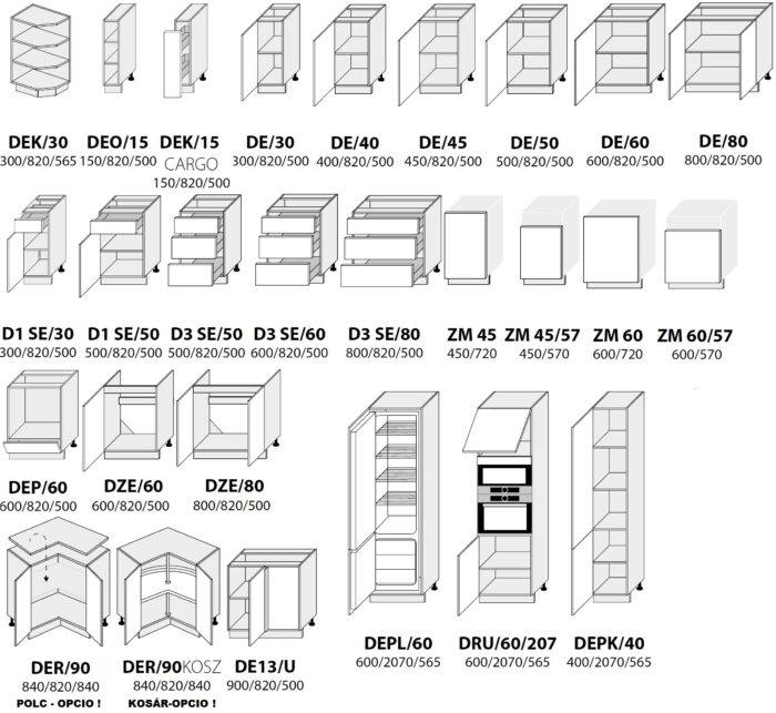 – Rendelhető kiegészítők: munkalap, munkalap összekötők/-fordítók/-végzárók, mosogató medence, csaptelep, külön fogantyúk, világítás, evőeszköz tartó az evőeszközös fiókba, felső elemek felrögzítéséhez fali szerelő sín. Ezen termékek rendelési feltételeiről minden esetben ügyfélszolgálatunkon, vagy a robi@robinagyker.hu E-mail címen tud felvilágosítást kérni.