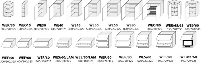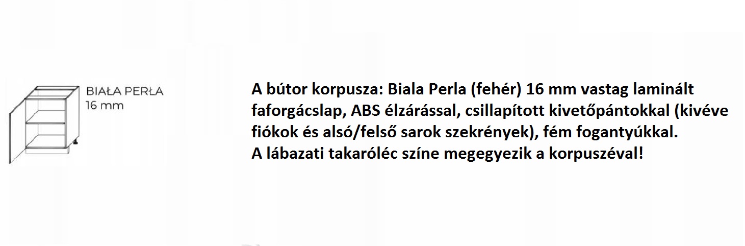 FEHÉR-BIALY PERLA 16mm vastag faforgácslap ABS élzárással és csillapított kivetőpántokkal (kivéve a fiókos és sarok szekrények) . A korpusz szerelék csomagja tartalmazza a szélességhez igazodo fém fogantyút is. A lábazat színe megegyező a korpusz színével.