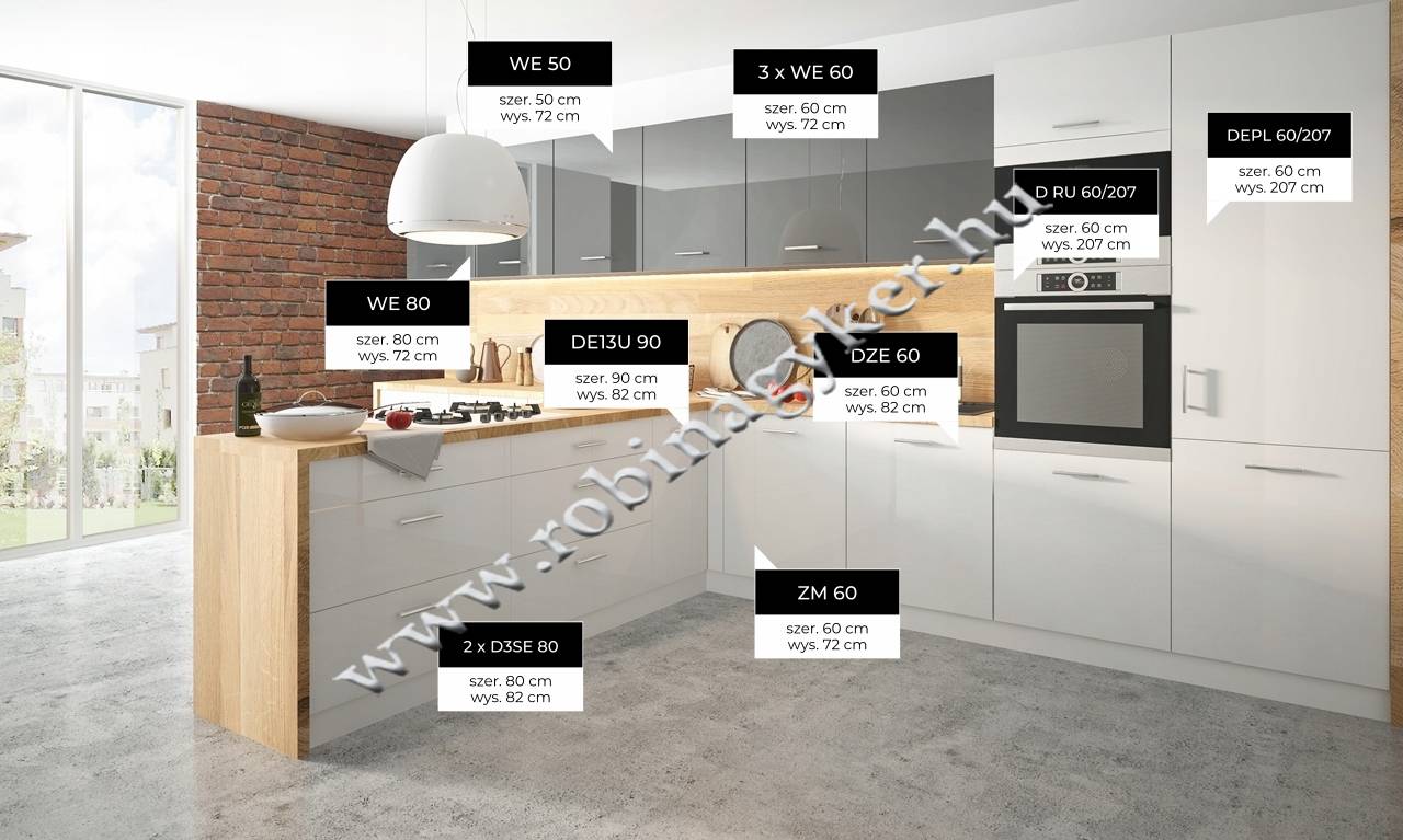 – Rendelhető kiegészítők: munkalap, munkalap összekötők/-fordítók/-végzárók, mosogató medence, csaptelep, külön fogantyúk, világítás, evőeszköz tartó az evőeszközös fiókba, felső elemek felrögzítéséhez fali szerelő sín. Ezen termékek rendelési feltételeiről minden esetben ügyfélszolgálatunkon, vagy a robi@robinagyker.hu E-mail címen tud felvilágosítást kérni.