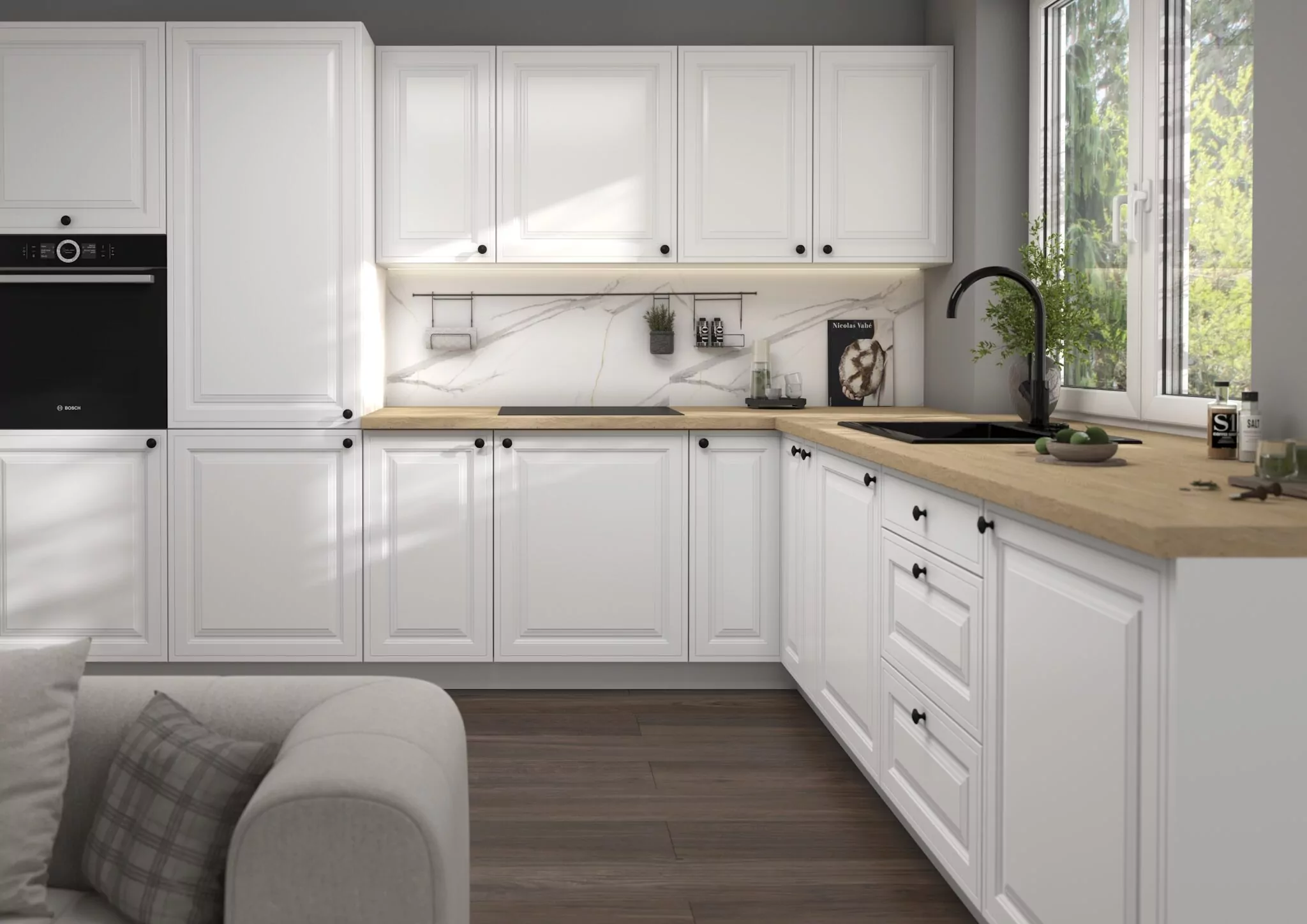 A FIRENZE első pillantásra a frontkialakításával fog meg. A keretes, mart ajtófelület elegáns, harmonikus és arányos. Nem túl díszes, nem túl minimalista, hanem éppen azt az egyensúlyt hozza, amit sokan keresnek: legyen karaktere a bútoroknak, de ne váljanak túl nehézkessé vagy régimódivá. Ez különösen fontos egy olyan helyiségben, mint a konyha, ahol a bútor vizuálisan nagy felületet foglal el.