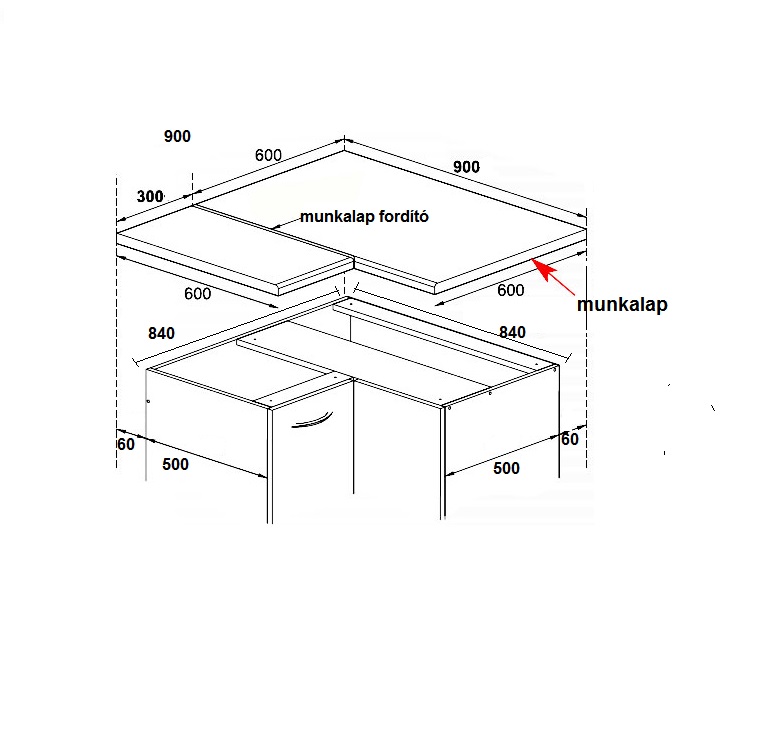 A sarok elem beépítési mérete a munkalap tekintetében 90 x 90 cm!!