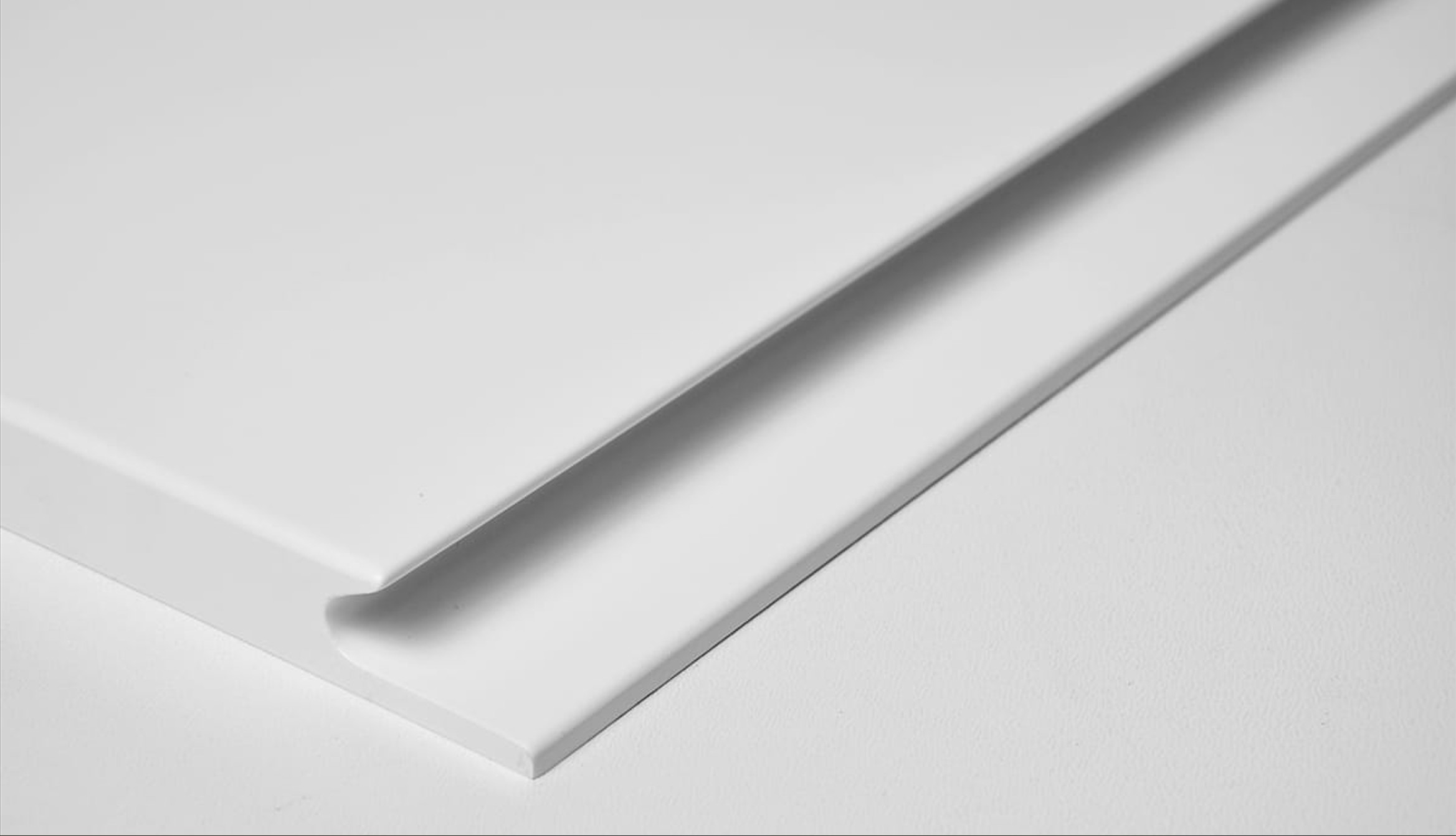 Közeli fotó a mart fogantyús (külső fogantyú nélküli) magasfényű fehér front élkiképzéséről, amely modern és letisztult megjelenést ad a konyhának.