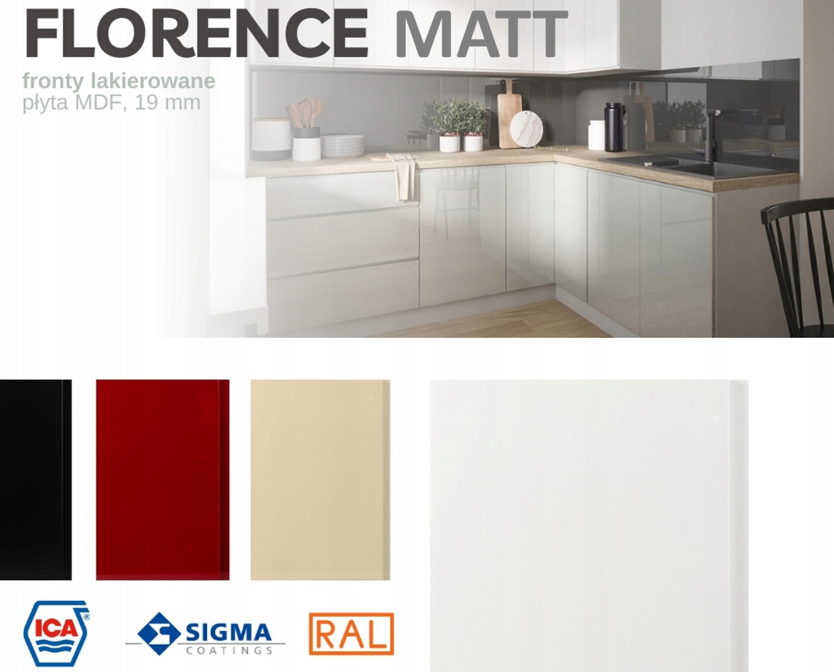 A FLORENCE konyhabútor MATT kollekció a modern otthonok kedvence: matt felület, elegáns megjelenés, precíz illesztések és rugalmas elemes konyhabútor rendszer, amellyel kicsi és nagy terekben is profi eredmény érhető el. A mart fogantyúk kellemes fogást biztosítanak és diszkréten látják el a faladatukat.A legmagasabb minőségű lakkozott frontok – 19 mm vastag MDF előlapok, HAT RÉTEGGEL: 3 alapozóréteg, 3 lakkréteg. Az előlapok egyedi gyártásúak, több száz különböző színben az ICA és NCS és a RAL paletták alapján.