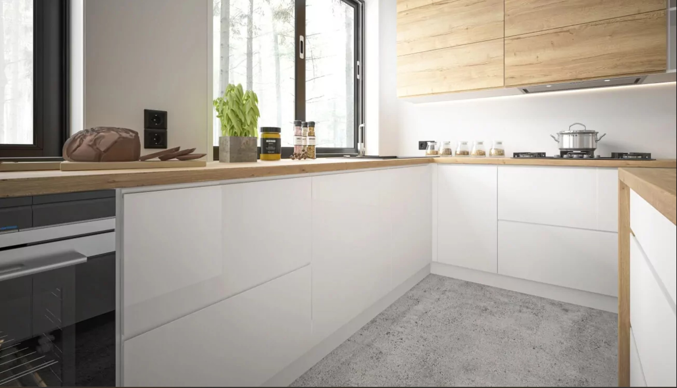 A moduláris konyhabútor kialakítás jó lehetőséget ad arra, hogy akár egy hangsúlyos munkalappal (fa hatás, kő hatás, sötétebb tónus) ellensúlyozd a világos frontokat, vagy fordítva: sötétebb színű frontok mellé világosabb felületeket válassz.