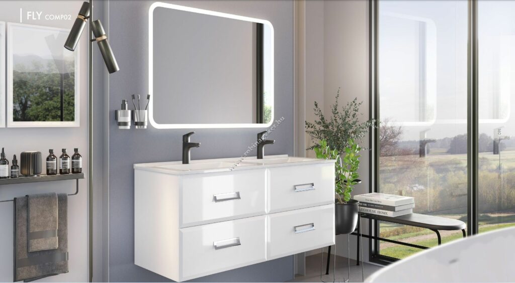 A FLY praktikus és modern fürdőszobabútor család az esztétika és a funkcionalitás közötti harmóniára összpontosított tervezési folyamat eredménye.Négy mosdó méretváltozatban kapható, 60, 80,100 és 120 cm szélességben. A mosdós szekrényeken kívül fali szekrények is választhatóak jobbos vagy balos ajtó nyitással. A frontok magasfényű letisztult formája és a fém chrom fogantyúk együttes hatása biztosítja a modernitást.
