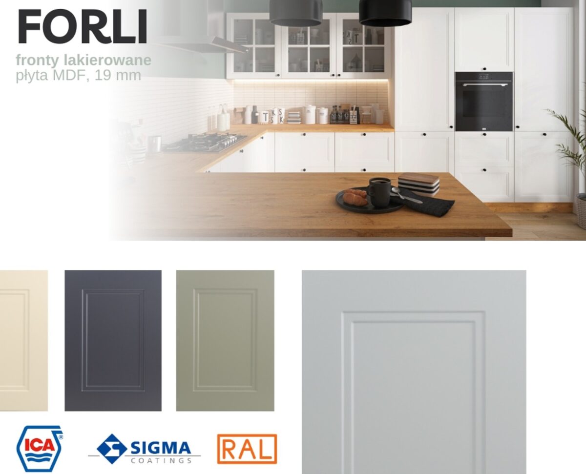 Bár a FORLI konyhabútor főként modern stílusú, letisztult formáival és matt frontjaival a klasszikus terekben is megállja a helyét. Kombinálható fa mintázatú munkalappal vagy fekete kiegészítőkkel, így akár skandináv, loft vagy minimalista irányzatú enteriőrben is harmonikus összhatást kelt.