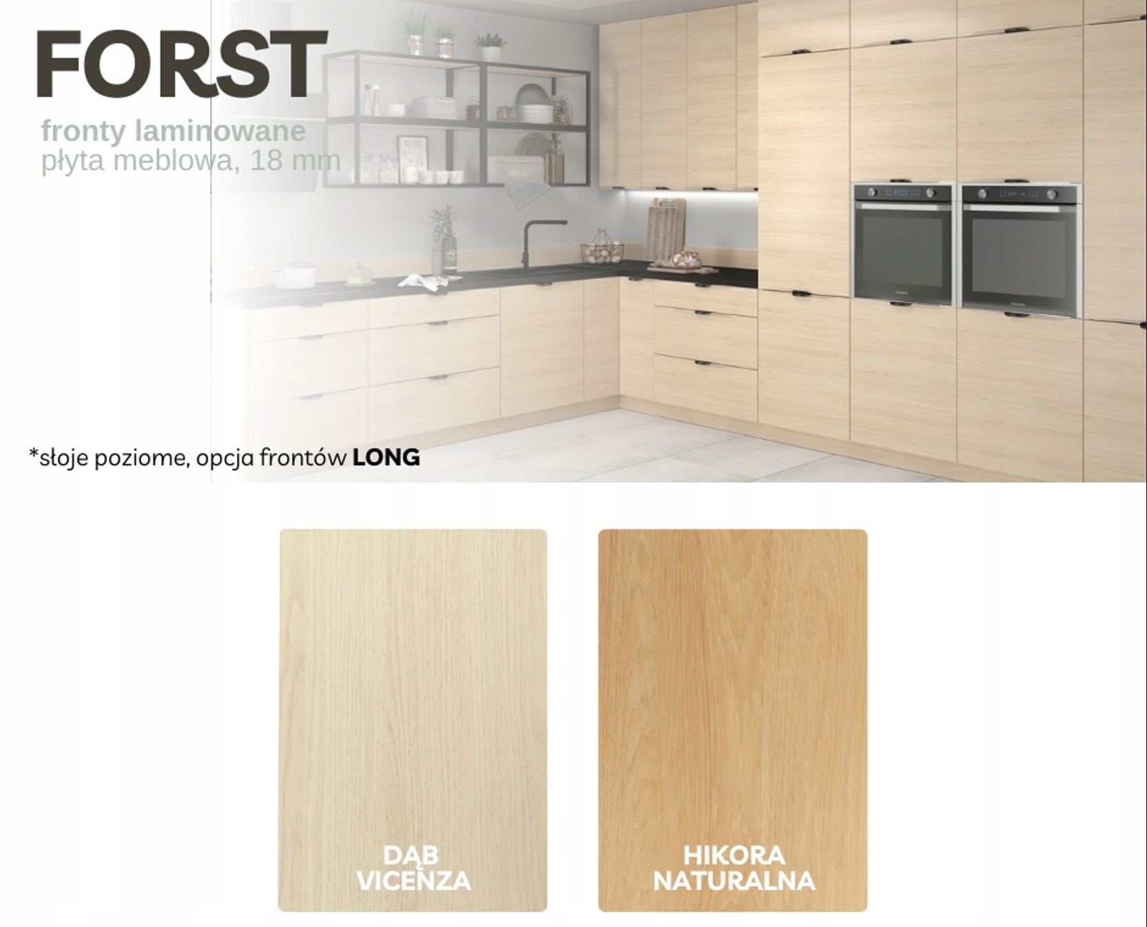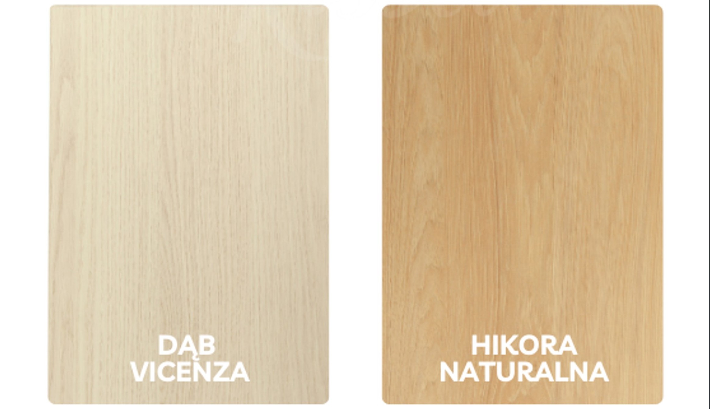 A FORST konyhabútor frontjai két egymáshoz illeszkedő, mégis jól elkülöníthető színben érhetők el: DAB VICENZA tölgy és HICORA NATURALNA tölgy.