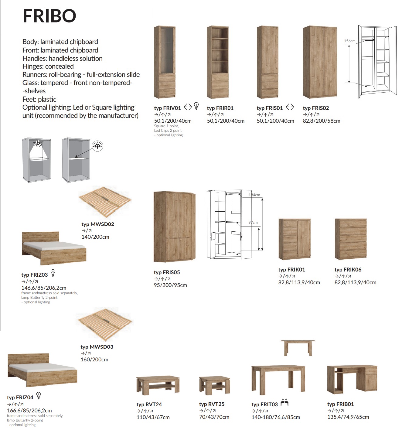 • A Fribo kollekció ABS élzárású laminált forgácslapból készül , ellenáll a nedvességnek, a karcolásoknak, a sérüléseknek és a magas hőmérsékletnek.
