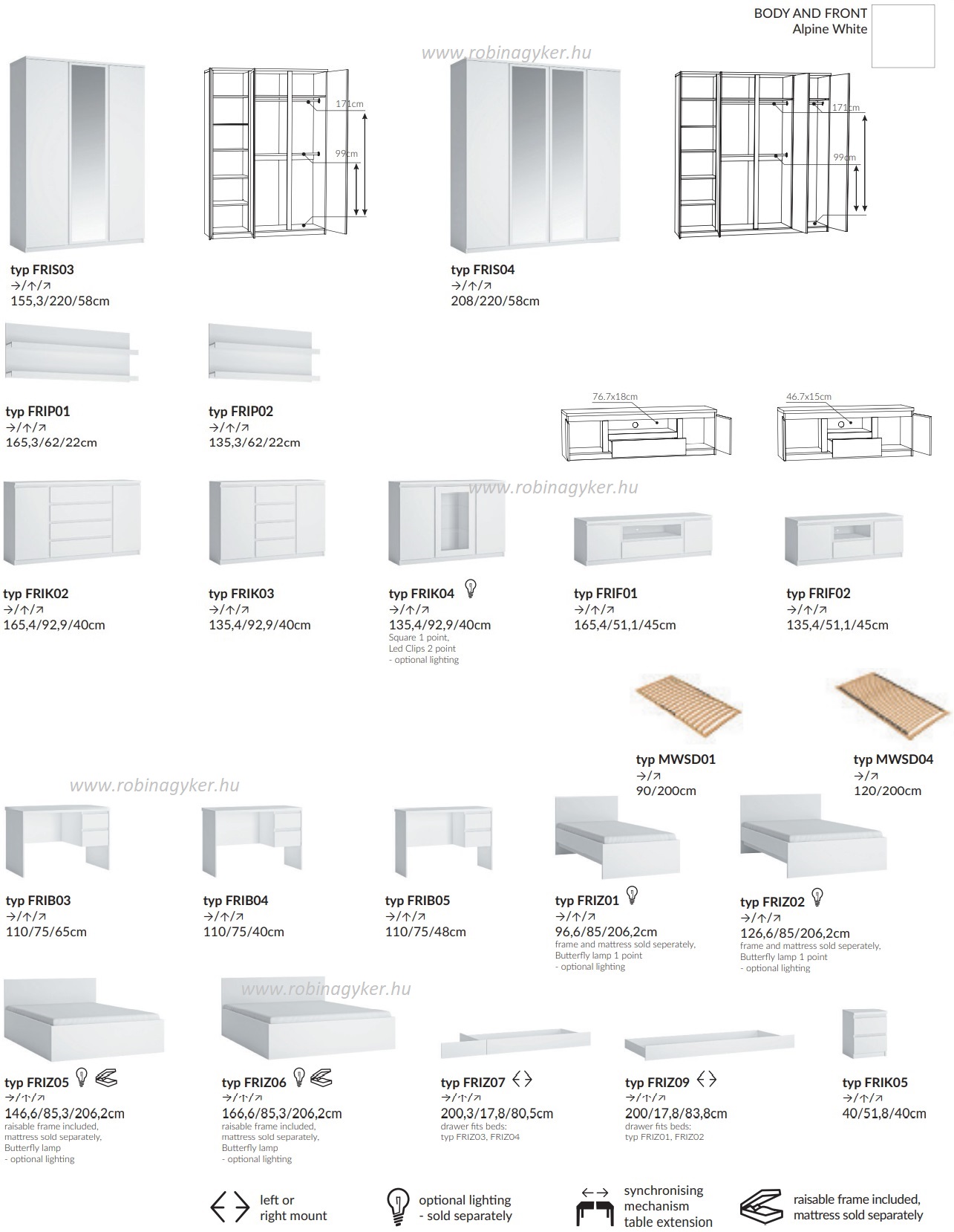 A bútorok egyszerű, minimalista formája beleillik a modern enteriőrbe, az alpesi fehér dekor pedig számtalan színkombinációt tesz lehetővé a szoba belsejében.Időtlen és univerzális, így bármilyen belső színsémát lehetővé tesz. Minden passzol a fehérhez.