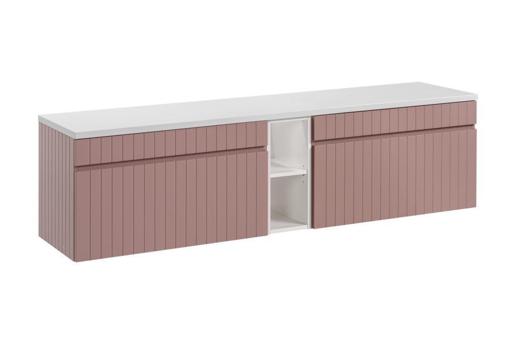 Részletfotó a rózsaszín, bordázott frontú mosdószekrényről fehér pulttal és dekor tálmosdóval; elegáns, modern összhatás.