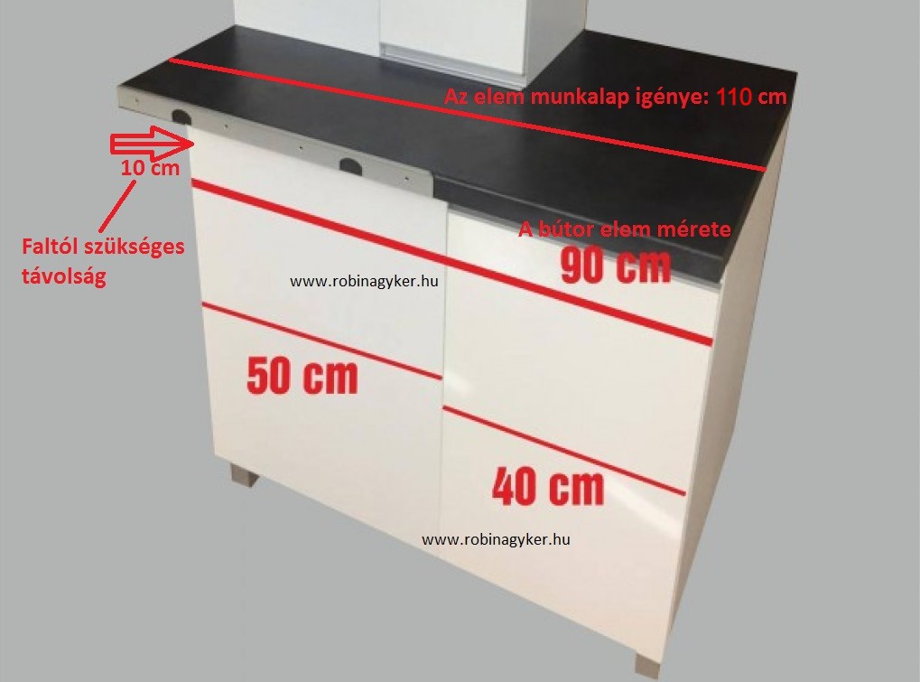 Erre az elemre így (103cm a bútor szélesség + 7 cm "helyigény"=) 110 cm munkalapot