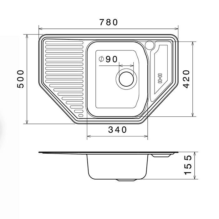 Kevmil KM-115 rozsdamentes sarok mosogató tálca 780 x 500 x 155 mm MUNKALAPBA VÁGÓS MOSOGATÓTÁLCA