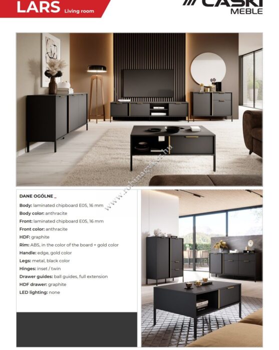 A modern LARS nappali összeállítás kiváló minőségű 16 mm-es laminált lapból készül, ellenáll a nedvességnek, a karcolásoknak és a magas hőmérsékletnek. A testet ABS szegély borítja.
