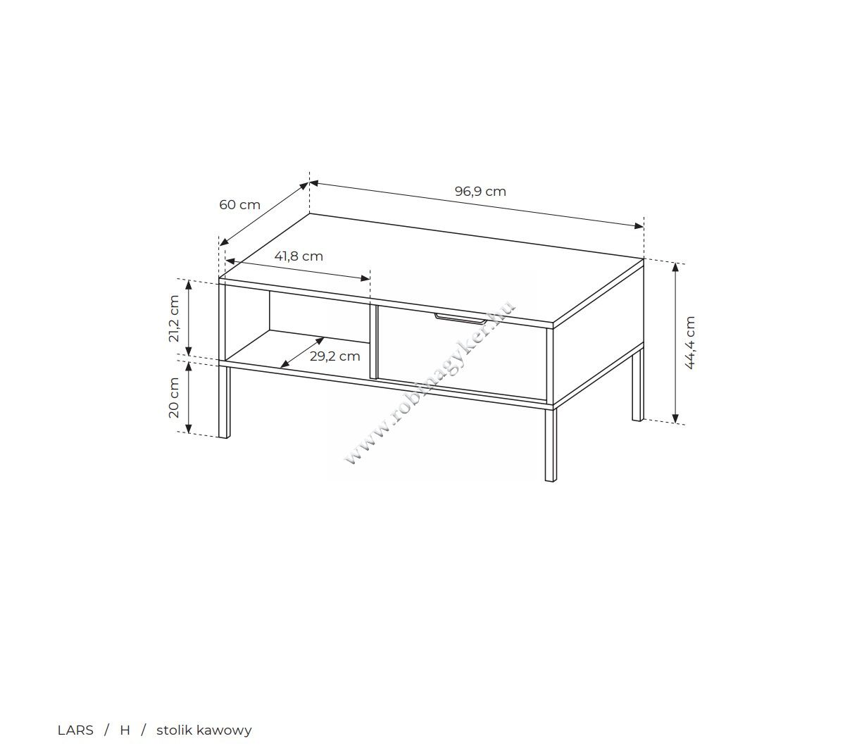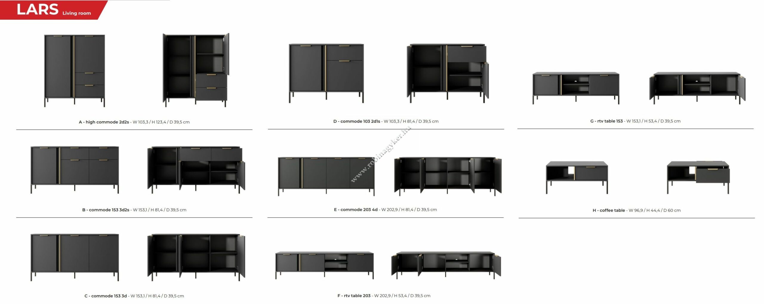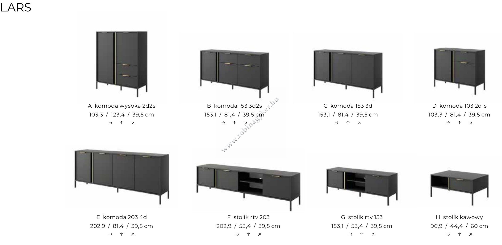 A modern LARS nappali összeállítás kiváló minőségű 16 mm-es laminált lapból készül, ellenáll a nedvességnek, a karcolásoknak és a magas hőmérsékletnek. A testet ABS szegély borítja.
