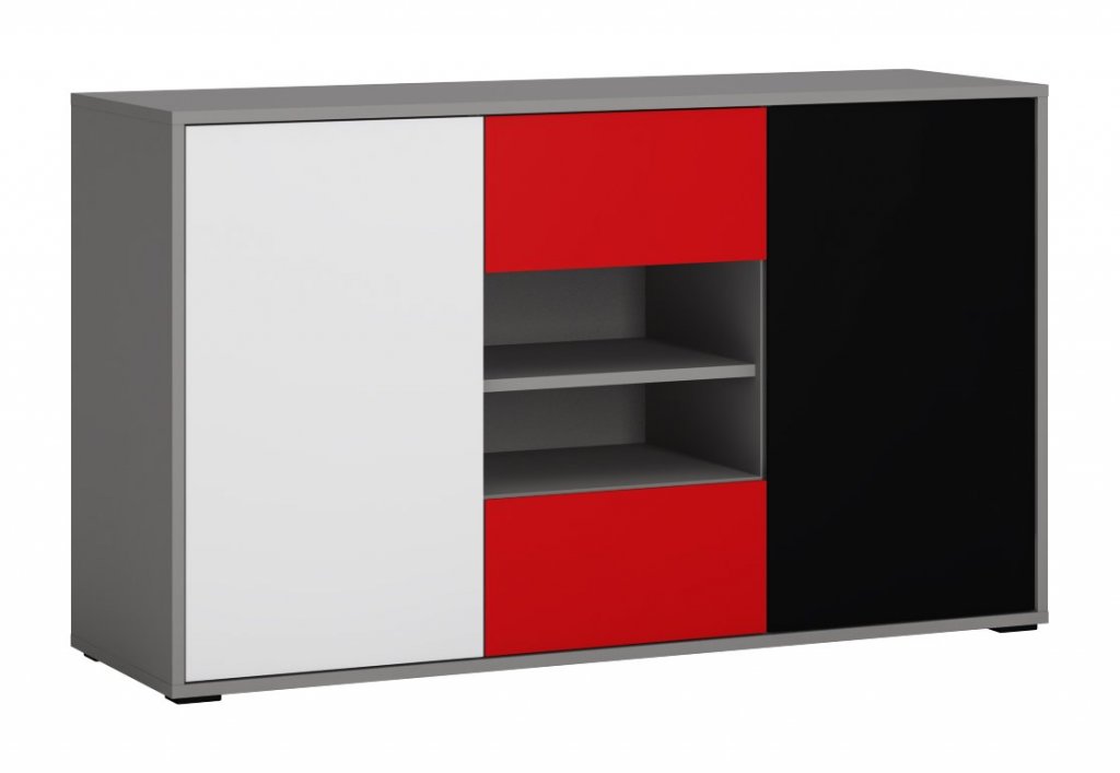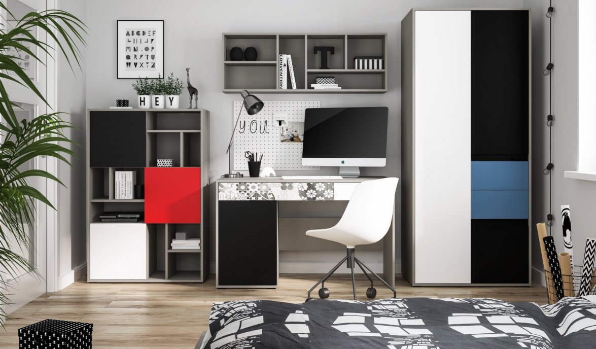 A LASER elemes ifjúsági szekrényrendszer kiváló választás ha ha mát tini korba lépett a gyermek és rá lehet bízni a neki megfelelő színek összeválogatását. Miután a gyermek kinőtte a hagyományos pasztell színeket akkor ideje a változásnak. A modern, minimalista dizájn és a választható frontok számos színvariánsa arra ösztönzi a tinédzsert, hogy kísérletezzen és keresse meg saját kombinációit. Piros és kék – miért ne?A három választható dekor front szín tökéletesen illeszkedik az alap szürke korpusz és fekete fehér front színekhez.