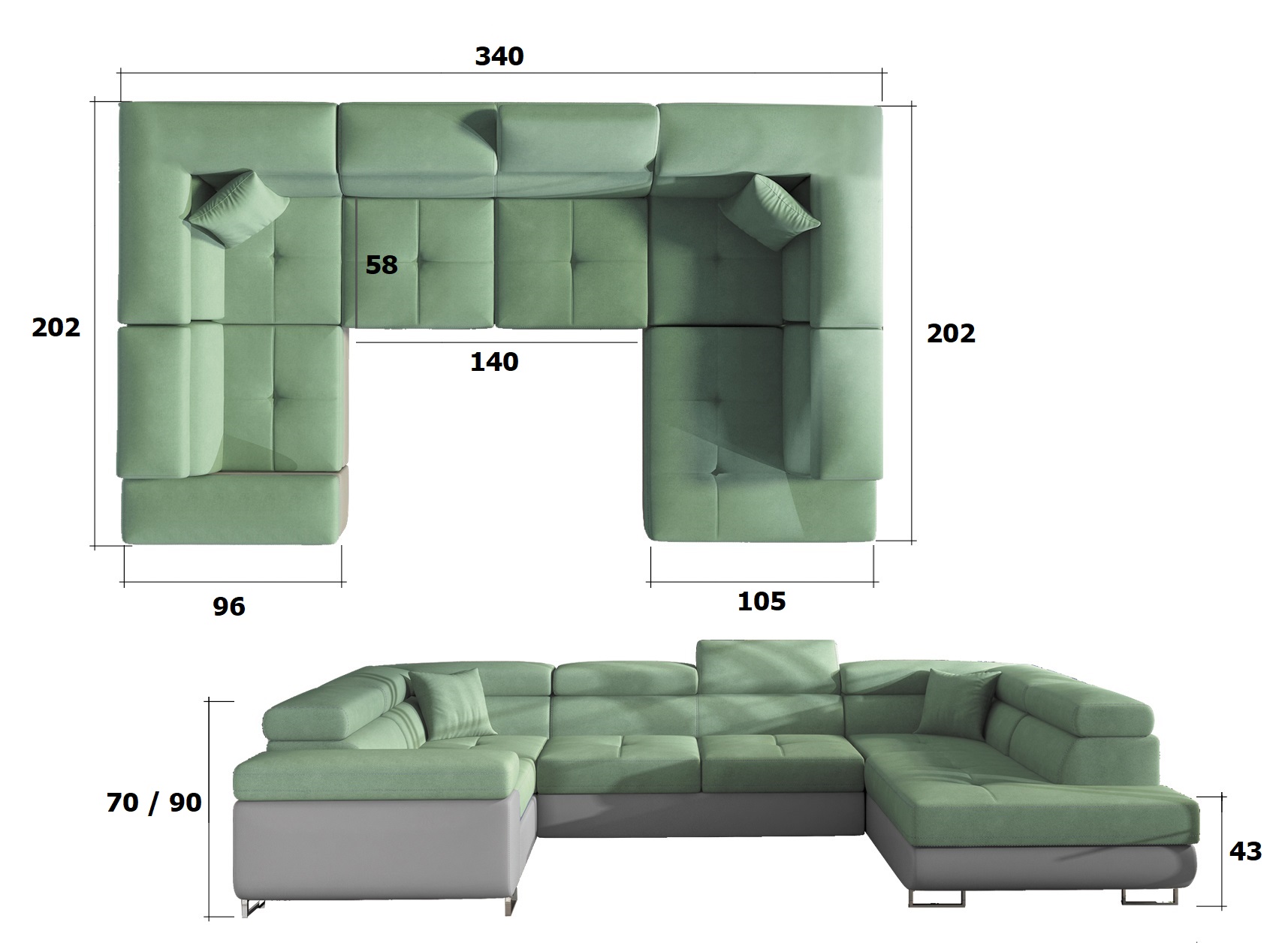 Szélesség 340 cm # Magasság 70/90 cm # Mélység 202/202cm#