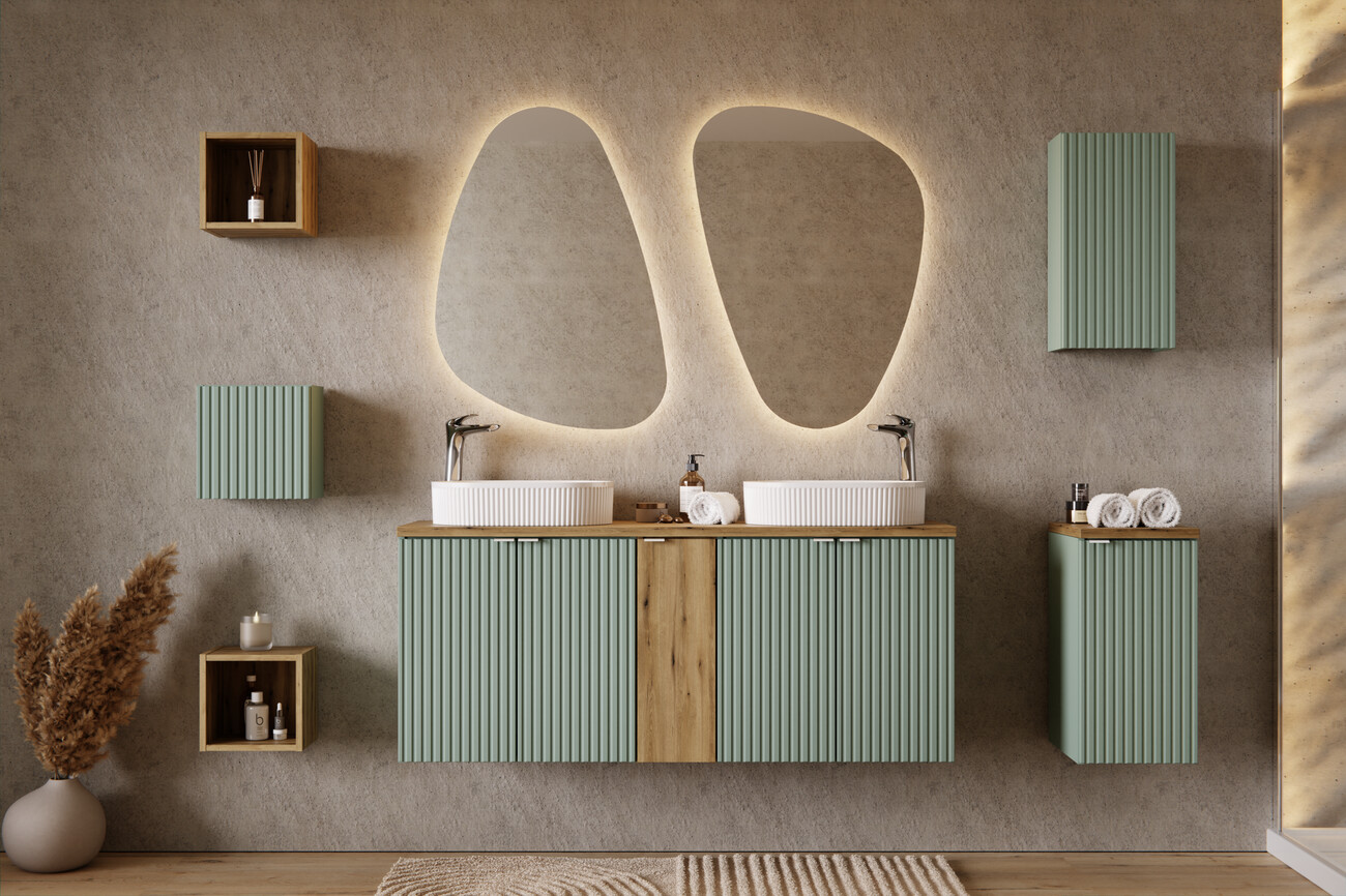 Prémium LINE REED GREEN komplett fürdőszoba bútor összeállítás. Kb. ~140 cm széles kivitel. Matt nádzöld (reed green) bordázott front meleg tölgy betéttel, modern lebegő hatással és könnyű tisztíthatósággal. Magas tárolómodullal a törölközőknek és pipere cuccoknak. Ráültethető dizájn mosdótál megoldásra optimalizálva. A csaptelep és/vagy szifon jellemzően nem része az alapcsomagnak.
