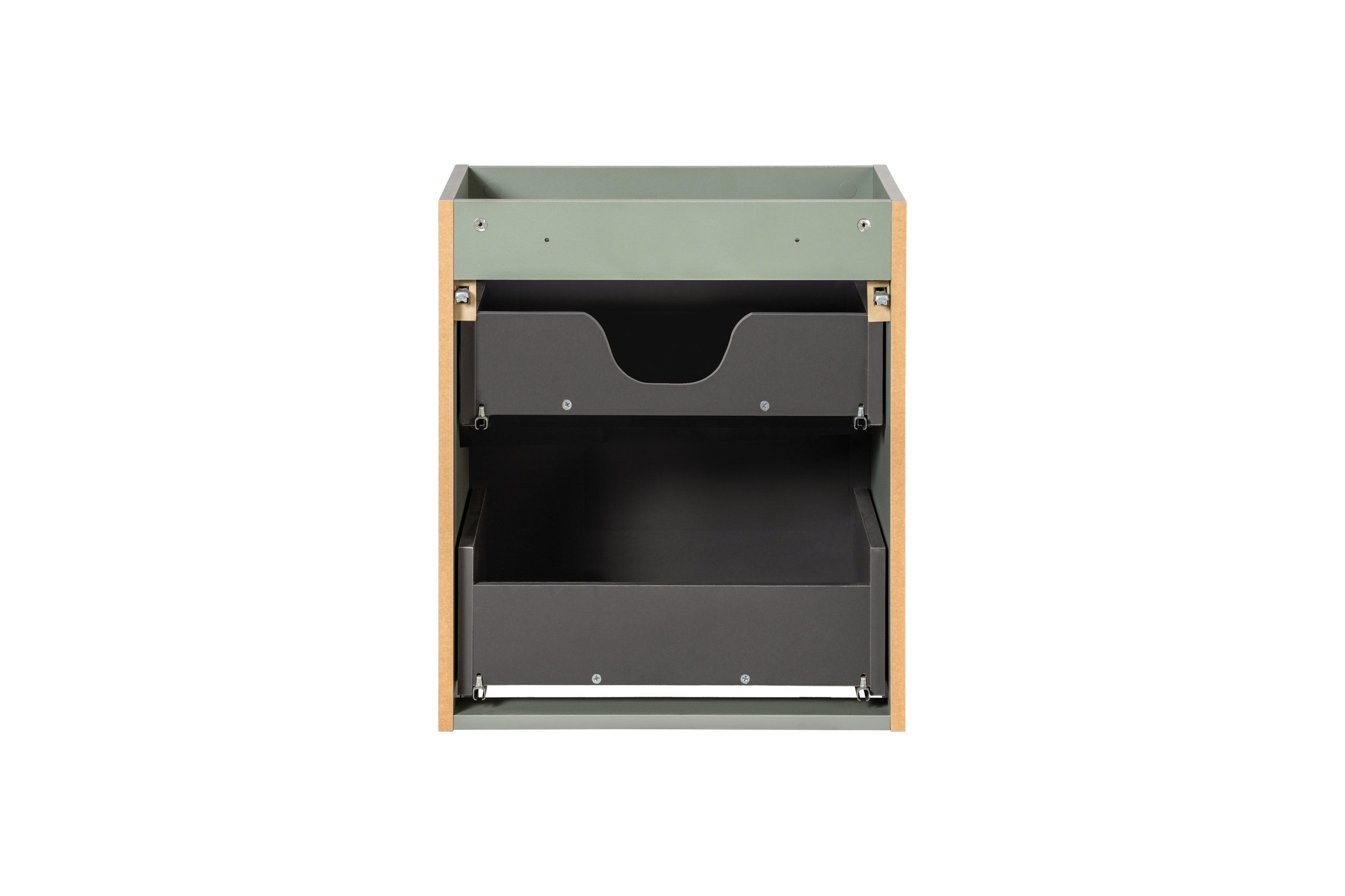 LINE REED GREEN kollekciós elem. Kb. ~50 cm széles kivitel. Matt nádzöld (reed green) bordázott front meleg tölgy betéttel, modern lebegő hatással és könnyű tisztíthatósággal. A csaptelep és/vagy szifon jellemzően nem része az alapcsomagnak.