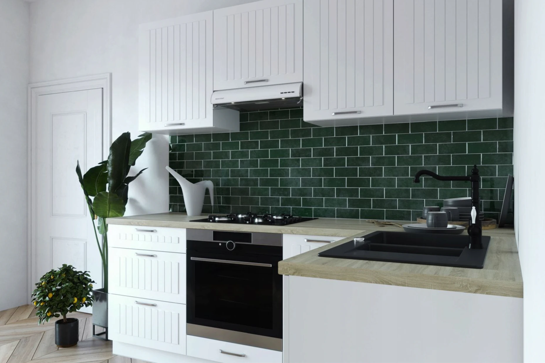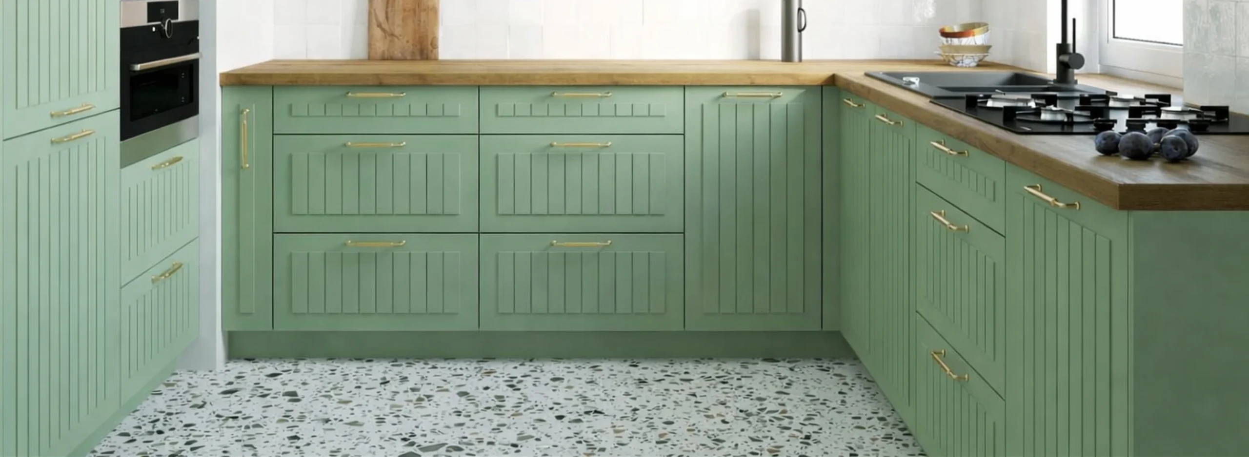 A LIVORNO képi világa jól mutatja, mennyire sokat számítanak a kísérő anyagok. A fekete fogantyúkkal párosított szürke vagy fehér összeállítás modernebb, határozottabb. A réz- vagy rozéarany jellegű fogantyúk melegebb, kifinomultabb irányba viszik a látványt, főleg krémes árnyalatokkal. A zöld változatnál a világos fa munkalap különösen harmonikus, mert természetes, puha átmenetet képez a szín és a fehér háttér között.