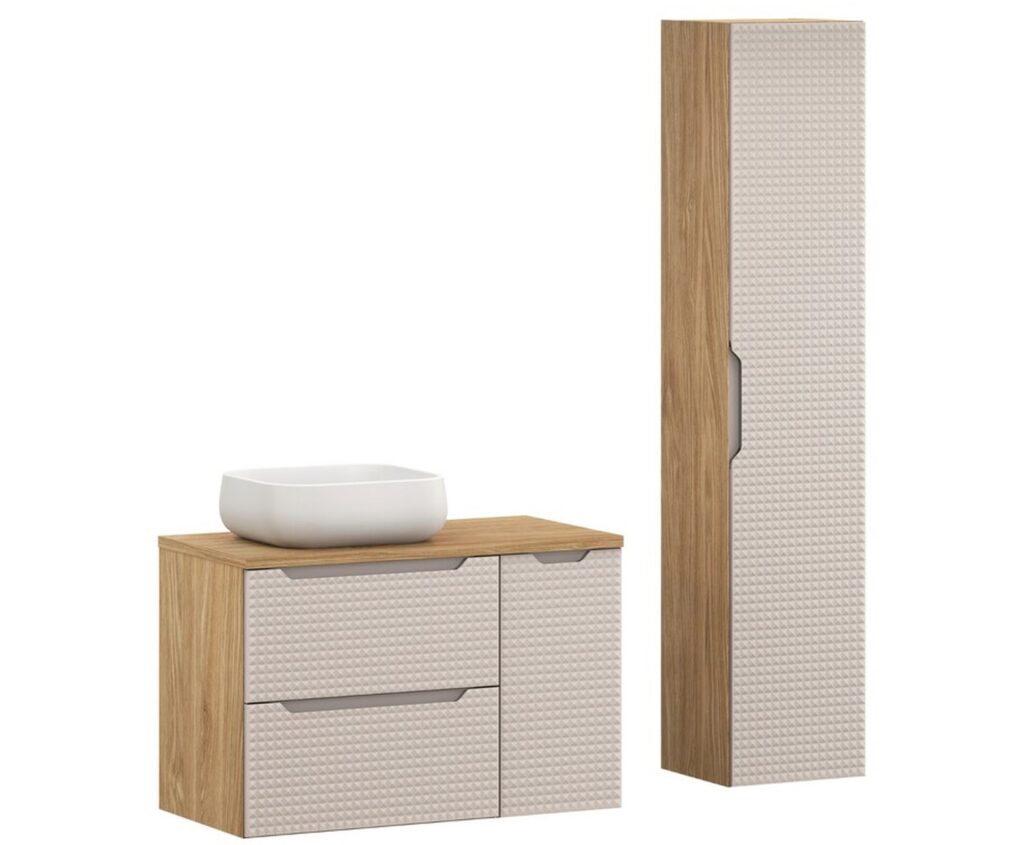 A Luxor Beige fürdőszoba bútor egyik legnagyobb erőssége a finoman 3D hatású, geometrikus fronttextúra.