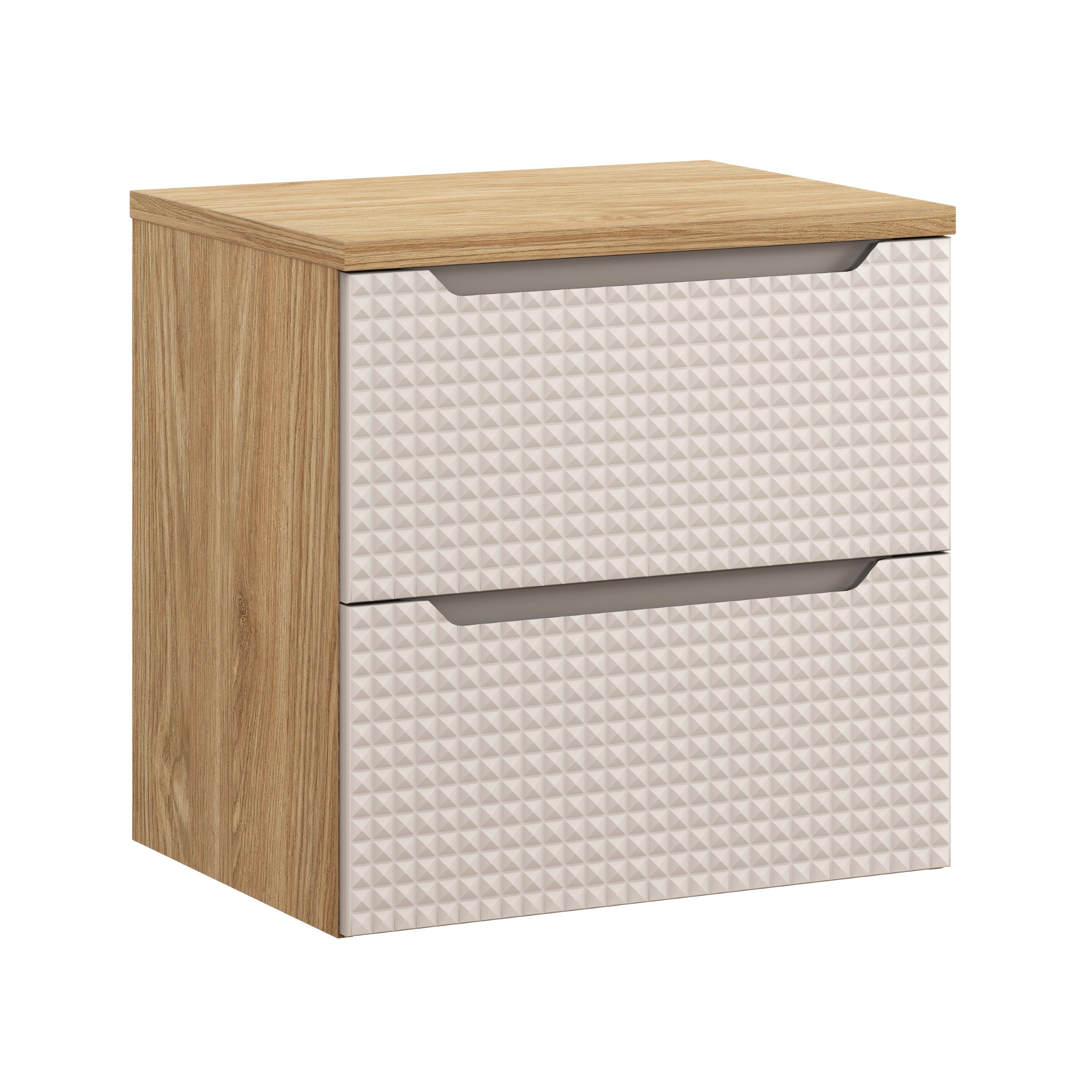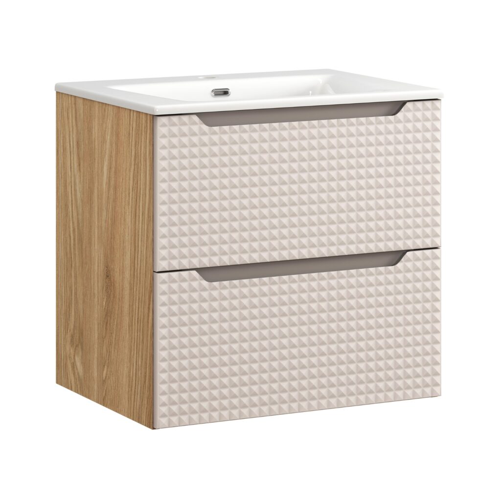 A Luxor Beige fürdőszoba bútor egyik legnagyobb erőssége a finoman 3D hatású, geometrikus fronttextúra.