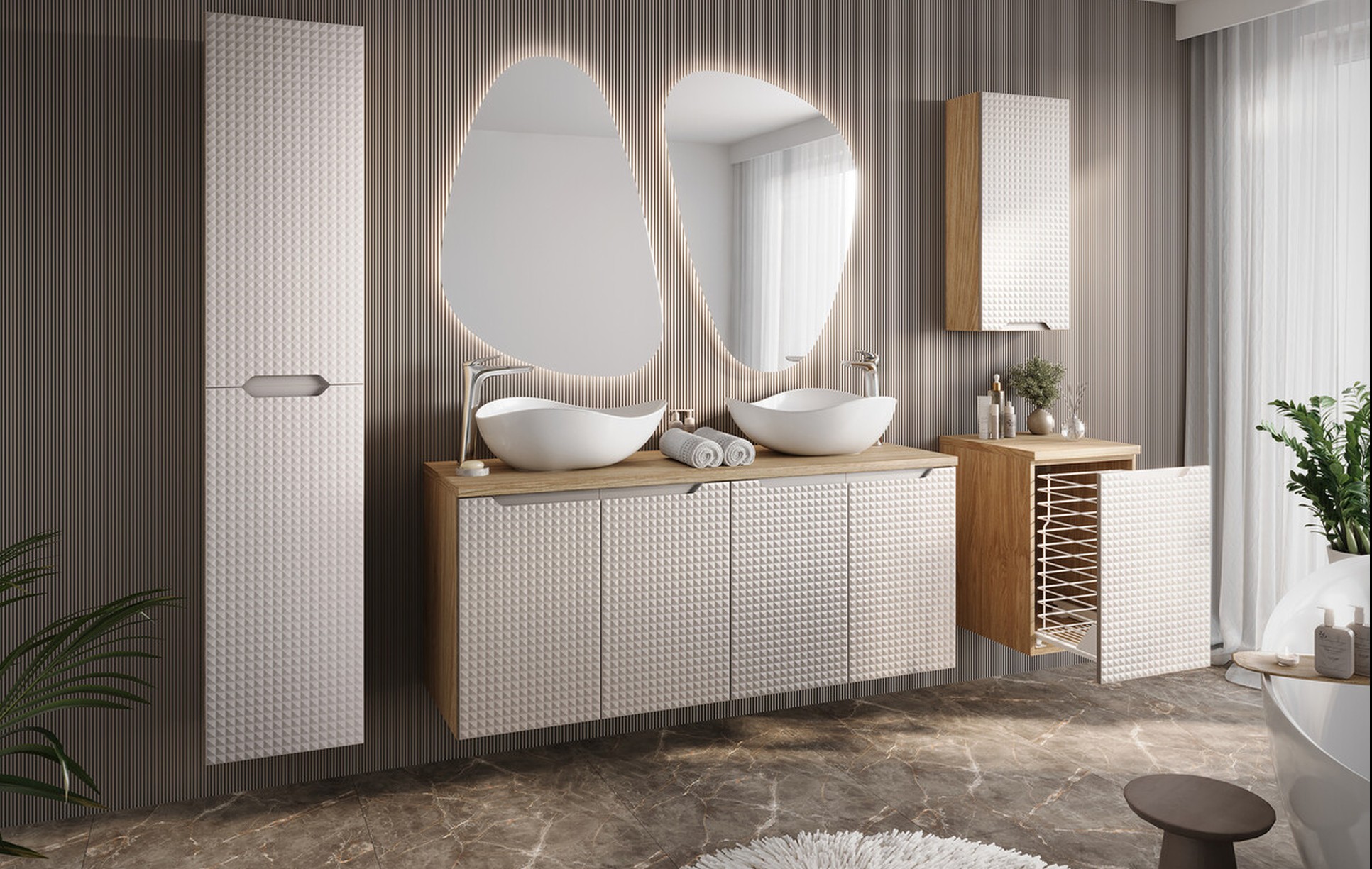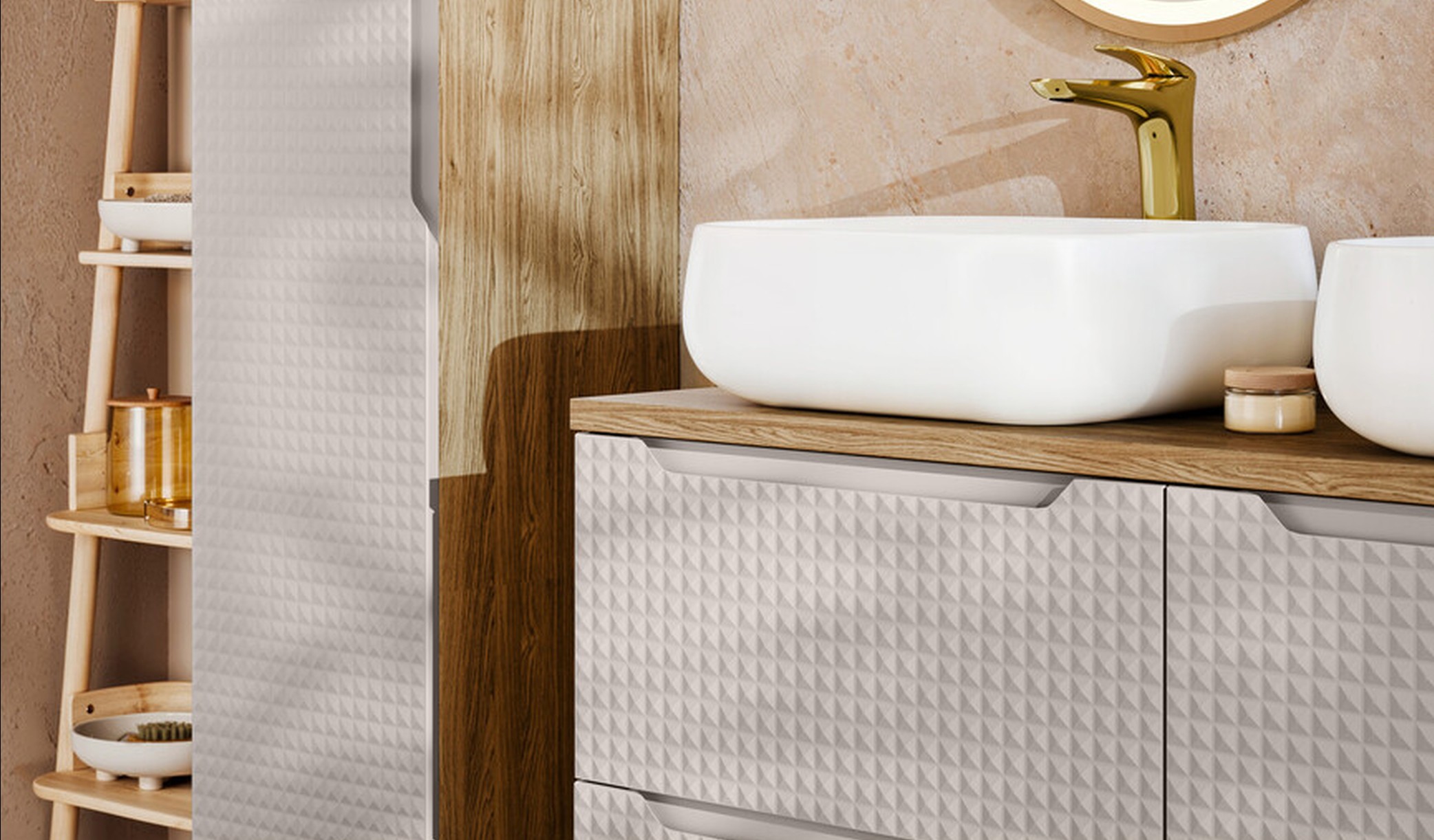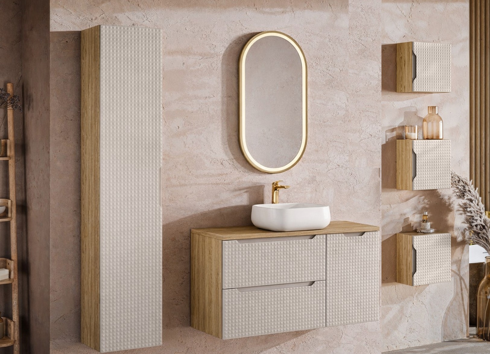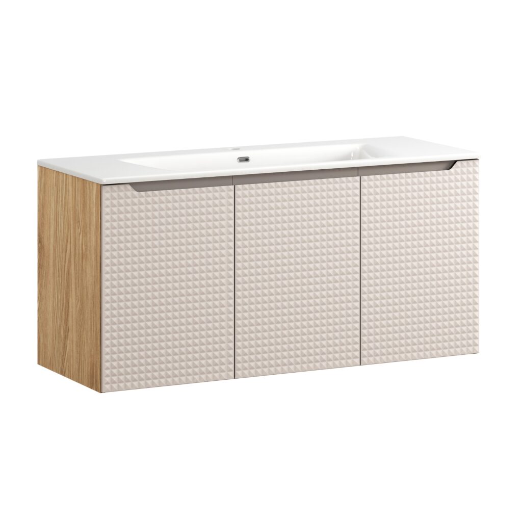 A Luxor Beige fürdőszoba bútor egyik legnagyobb erőssége a finoman 3D hatású, geometrikus fronttextúra.