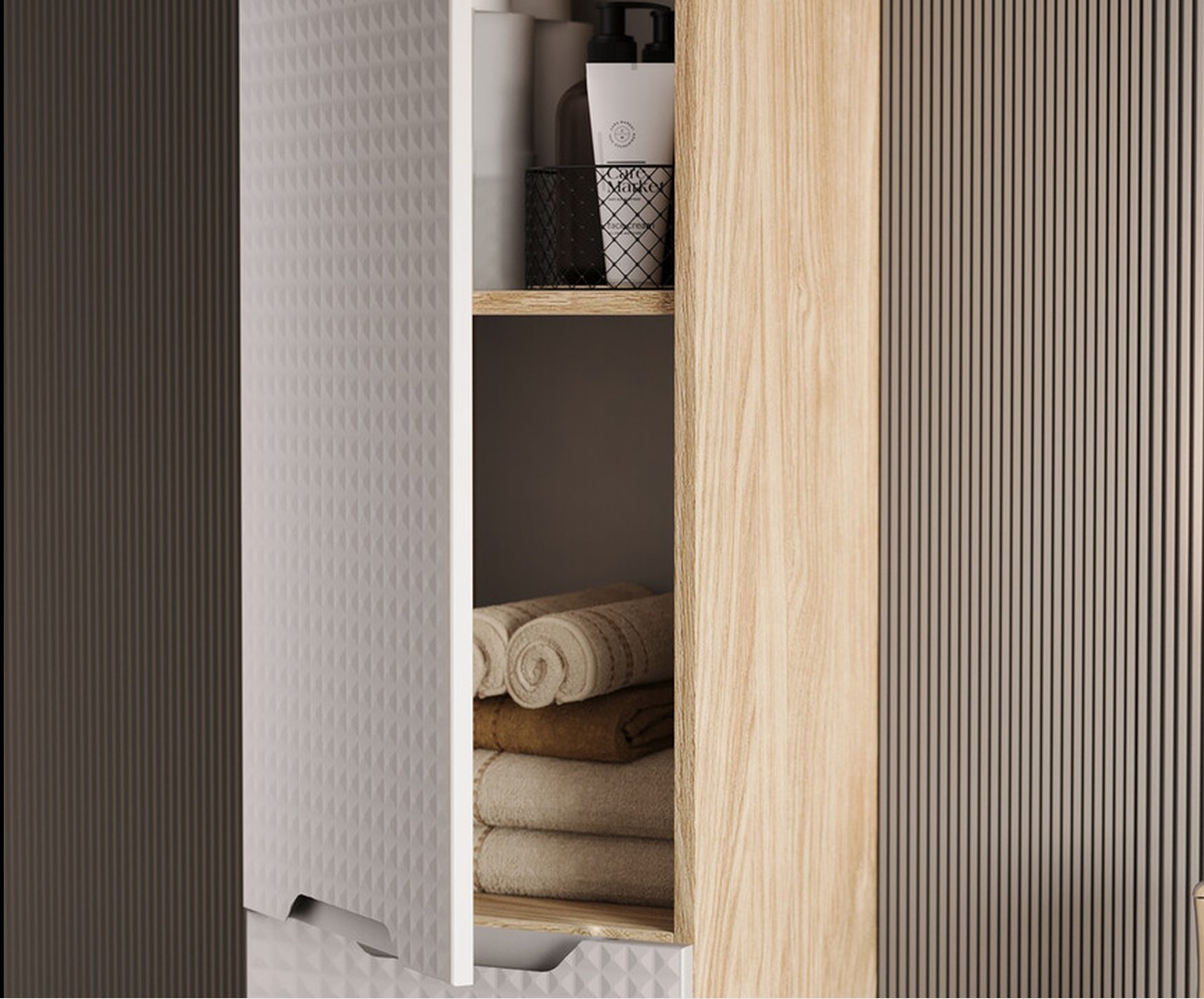 Ha LED-es tükröt vagy tükörvilágítást használsz, a texturált frontok árnyékai finoman megjelennek, ami még prémiumabbá teszi a fürdőszobabútor összképet.