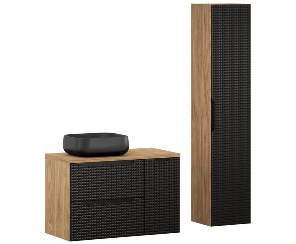 A LUXOR BLACK megjelenésének kulcsa a kontraszt. A fekete matt felület önmagában is elegáns, de itt nem „sima fekete” az összhatás: a 3D mintázat fénytörései miatt a front élőbb, prémiumabb hatású. Mellette a tölgy tónusú korpusz és pult természetes melegséget ad, így a végeredmény nem hideg, hanem kifejezetten barátságos. Ez a kettősség az, amitől ez a modern fürdőszoba bútor jól működik loft, minimal, skandináv és industrial enteriőrben is.