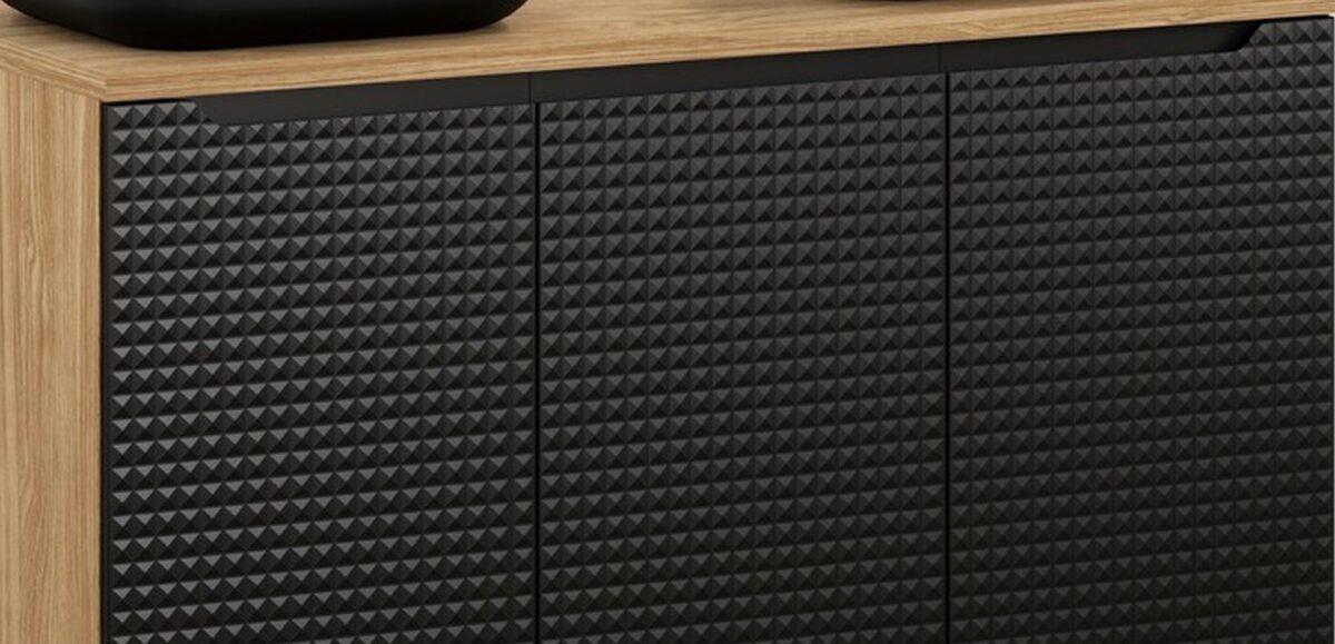 A LUXOR BLACK megjelenésének kulcsa a kontraszt. A fekete matt felület önmagában is elegáns, de itt nem „sima fekete” az összhatás: a 3D mintázat fénytörései miatt a front élőbb, prémiumabb hatású. Mellette a tölgy tónusú korpusz és pult természetes melegséget ad, így a végeredmény nem hideg, hanem kifejezetten barátságos. Ez a kettősség az, amitől ez a modern fürdőszoba bútor jól működik loft, minimal, skandináv és industrial enteriőrben is.