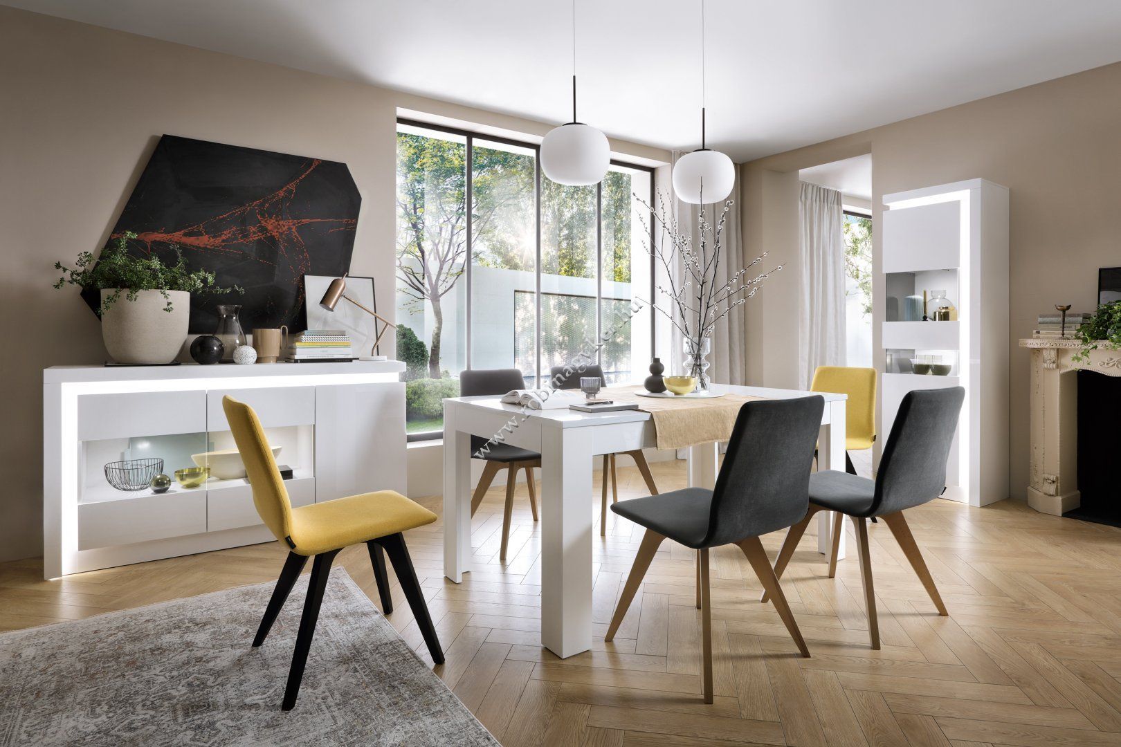 A LYON FEHÉR elemes szekrényrendszer kiváló választás ha modern nappali bútort szeretne otthonába.Az elemekben használt fehér, fényes homlokzatoknak köszönhetően a szobának nemcsak fényességet és fényerőt szerez, hanem optikailag is nagyít. A részlegesen üveges vitrin elemeknél az oldalsó és a felső koszorú aszimmetrikus háttérvilágítás egyedi belső varázst kölcsönöz a belső térnek. A meleg fényárnyék ideálisan hangsúlyos és a szobának ideális fényforrást is biztosít.