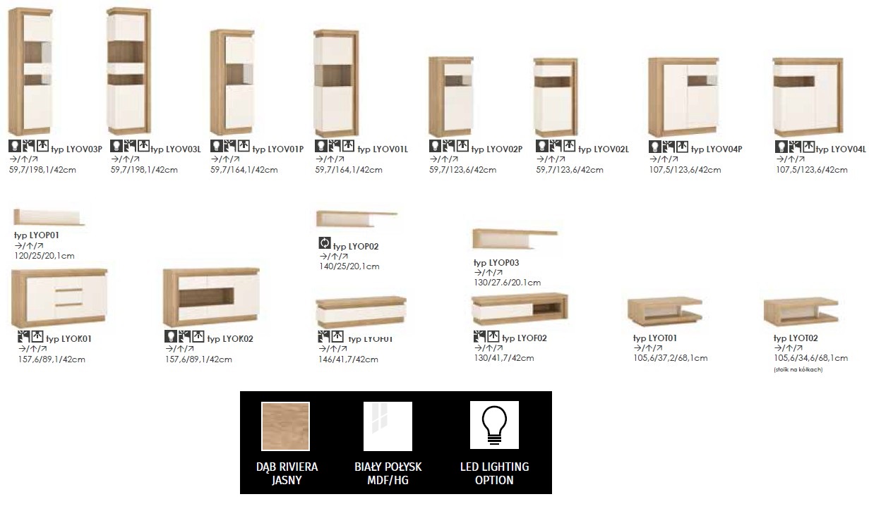 A LYON VILÁGOS elemes szekrényrendszer kiváló választás ha modern nappali bútort szeretne otthonába.Az elemekben használt fehér, fényes homlokzatoknak köszönhetően a szobának nemcsak fényességet és fényerőt szerez, hanem optikailag is nagyít. A fehér háttérrel ellentétben a Riviera Light Tölgy kihozza az egész kollekció természetes szépségét. A részlegesen üveges vitrin elemeknél az oldalsó és a felső koszorú aszimmetrikus háttérvilágítás egyedi belső varázst kölcsönöz a belső térnek. A meleg fényárnyék ideálisan hangsúlyozza a Riviera tölgy természetes dekorációját, és a szobának ideális fényforrást is biztosít.