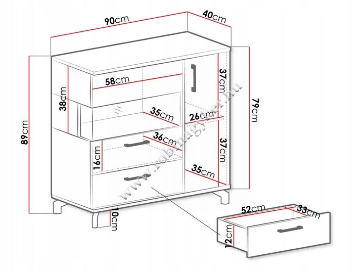 Az összeállítás elemei: MD11 komód 90/89/40cm (szél./mag./mélys.)