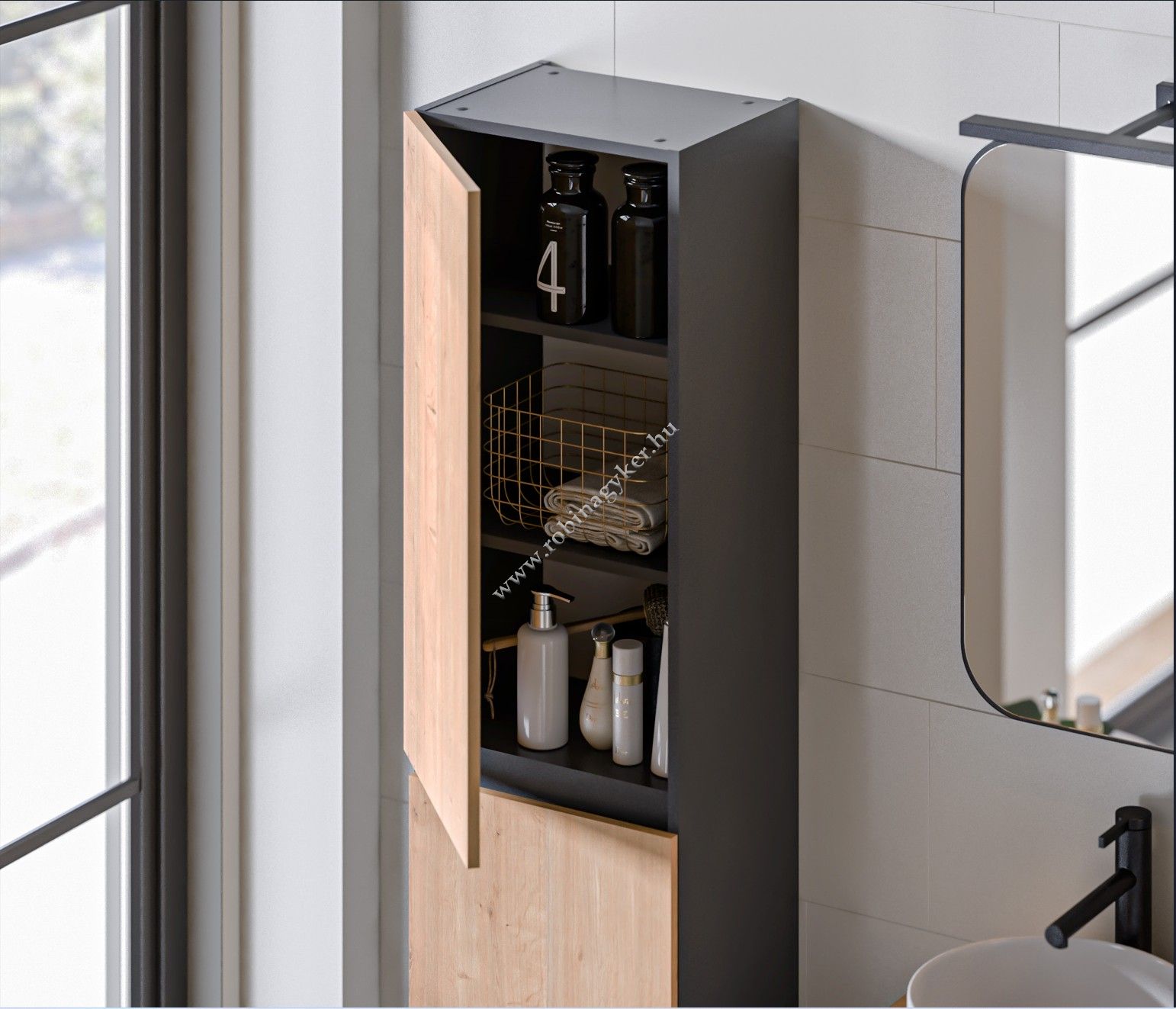 A Monako Grey kollekció modern stílusú fürdőszobabútorai mindenki számára vonzóak lesznek, akik értékelik az eredetiséget és az eredeti megoldásokat. A kollekció innovatív dizájnját a gyémántszürkével kombinált fa hatású előlapok hangsúlyozzák. A tükrös szekrények és mosdó szekrények többféle méretben kaphatók, süllyesztett mosdókagyló vagy ültetett mosdóval ellátott munkalap használatára is van lehetőség. A Monaco bútorok opcionálisan falra függeszettként vagy fémlábakra állva is felszerelhetők. A lábakra erősített kiegészítő polc egyedi karaktert ad nekik. A kollekciót egyedi dizájn és jól megválasztott színek jellemzik. A Monaco kollekció bútorait a legújabb trendeknek megfelelően tervezték belsőépítész designerek.