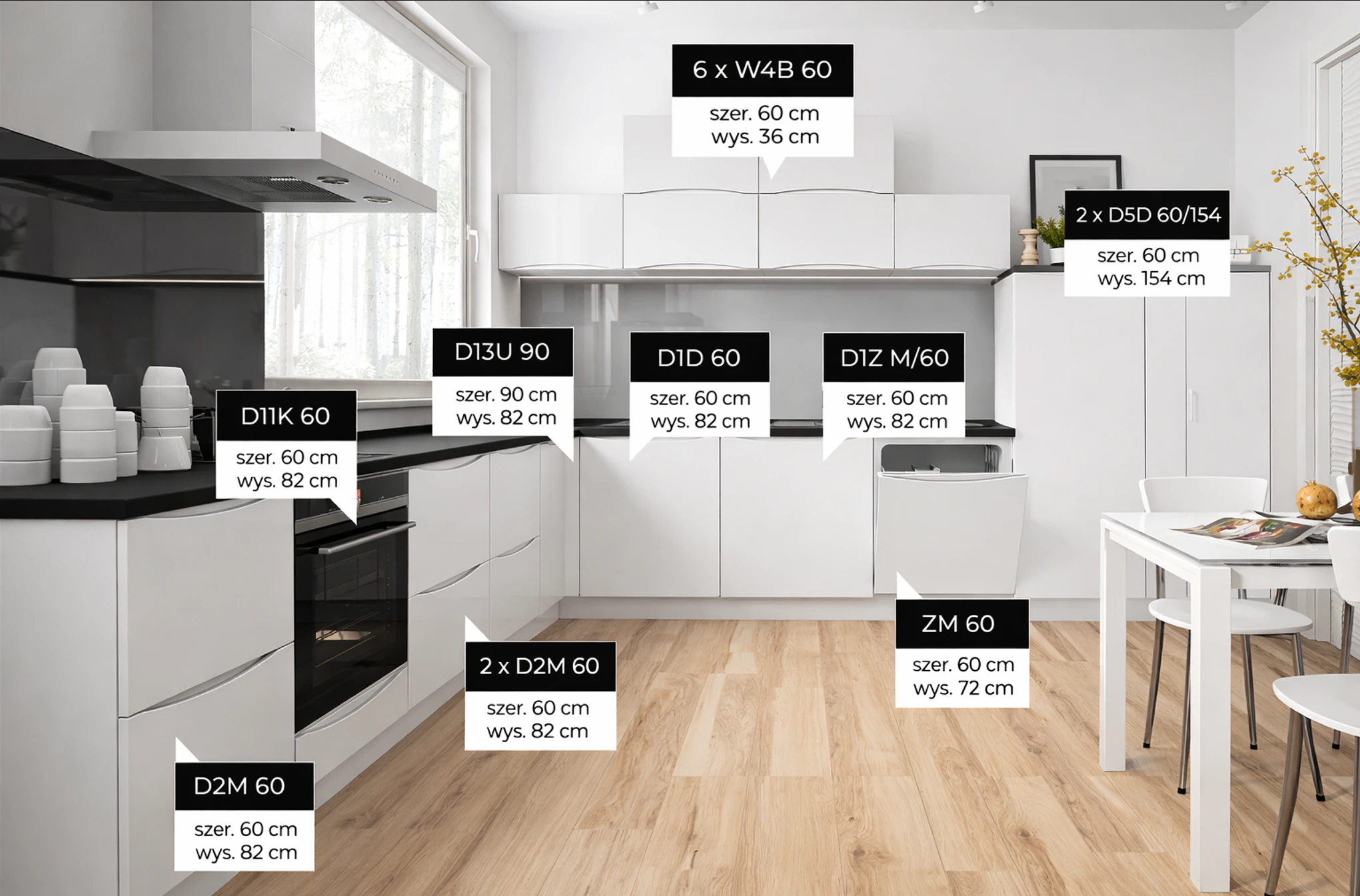 (szélesség x magasság [cm] – a szekrények méretei munkalap nélkül)