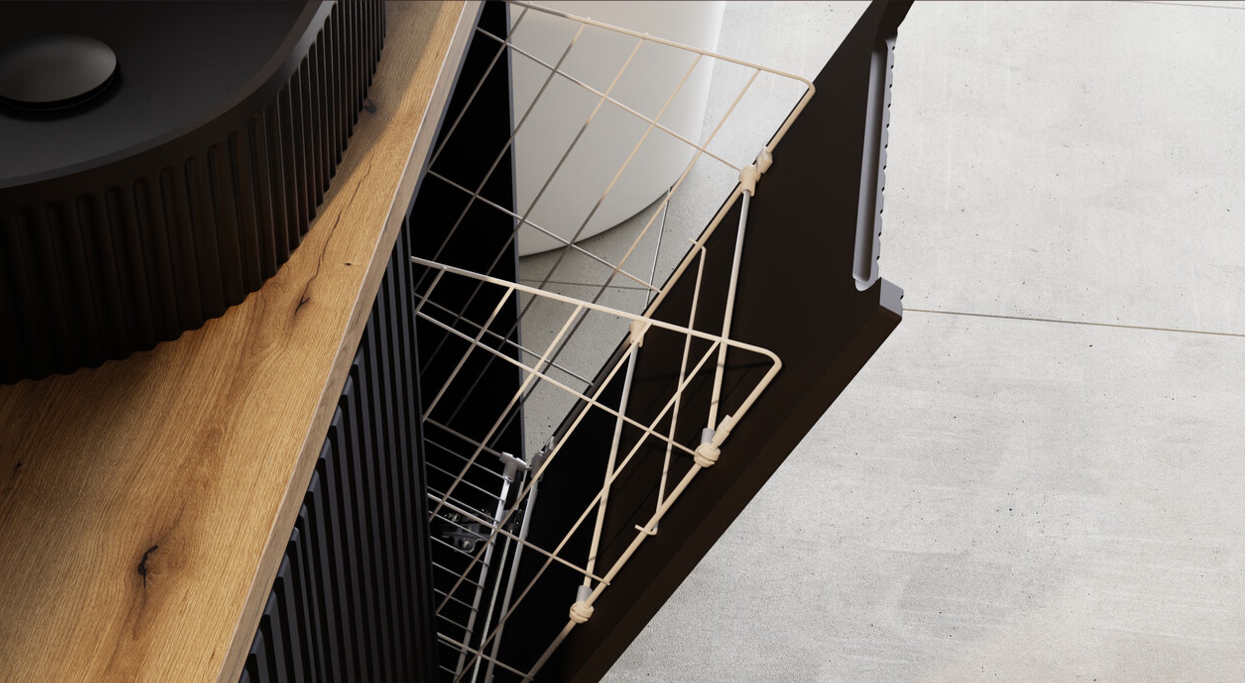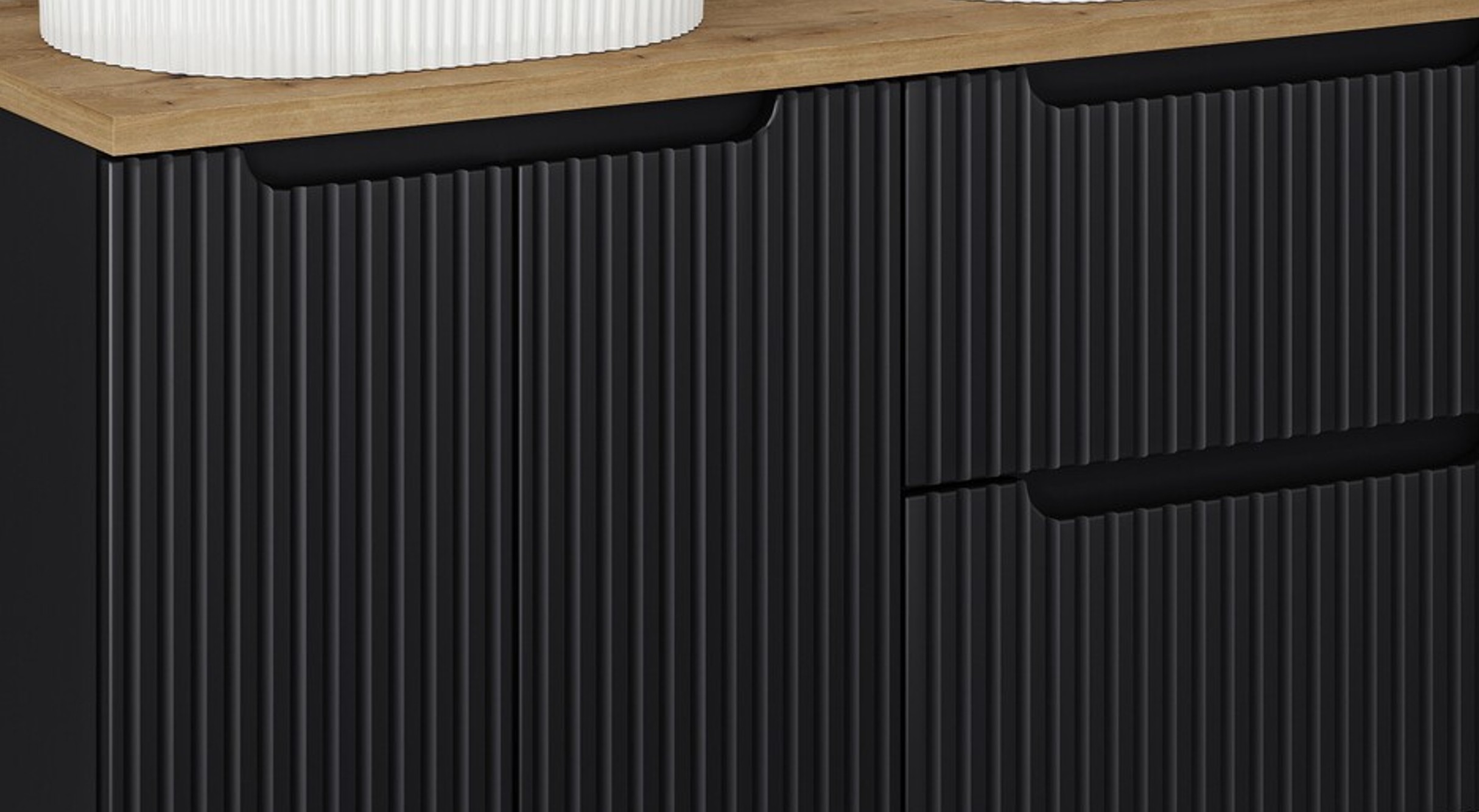A kollekciót első pillantásra felismerhetővé teszi a függőleges bordázás, ami modern, ritmikus felületet ad. Ez nem pusztán dísz: a fény-árnyék játék miatt a bútor “él”, még akkor is, ha a szín egységesen fekete. A frontokhoz gyakran társul süllyesztett vagy integrált fogásmegoldás, ami letisztultabb, mint a külső fogantyú, és könnyebben tartható egységes stílusban.
