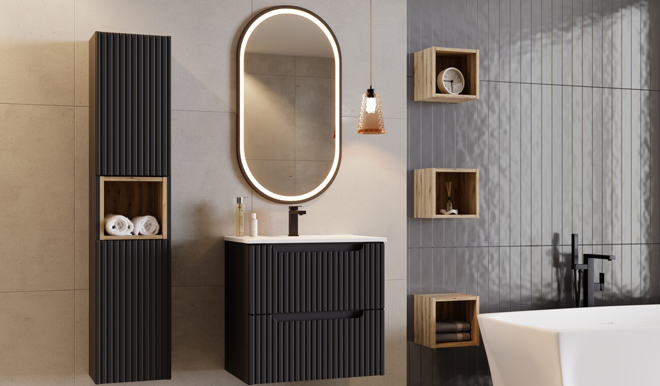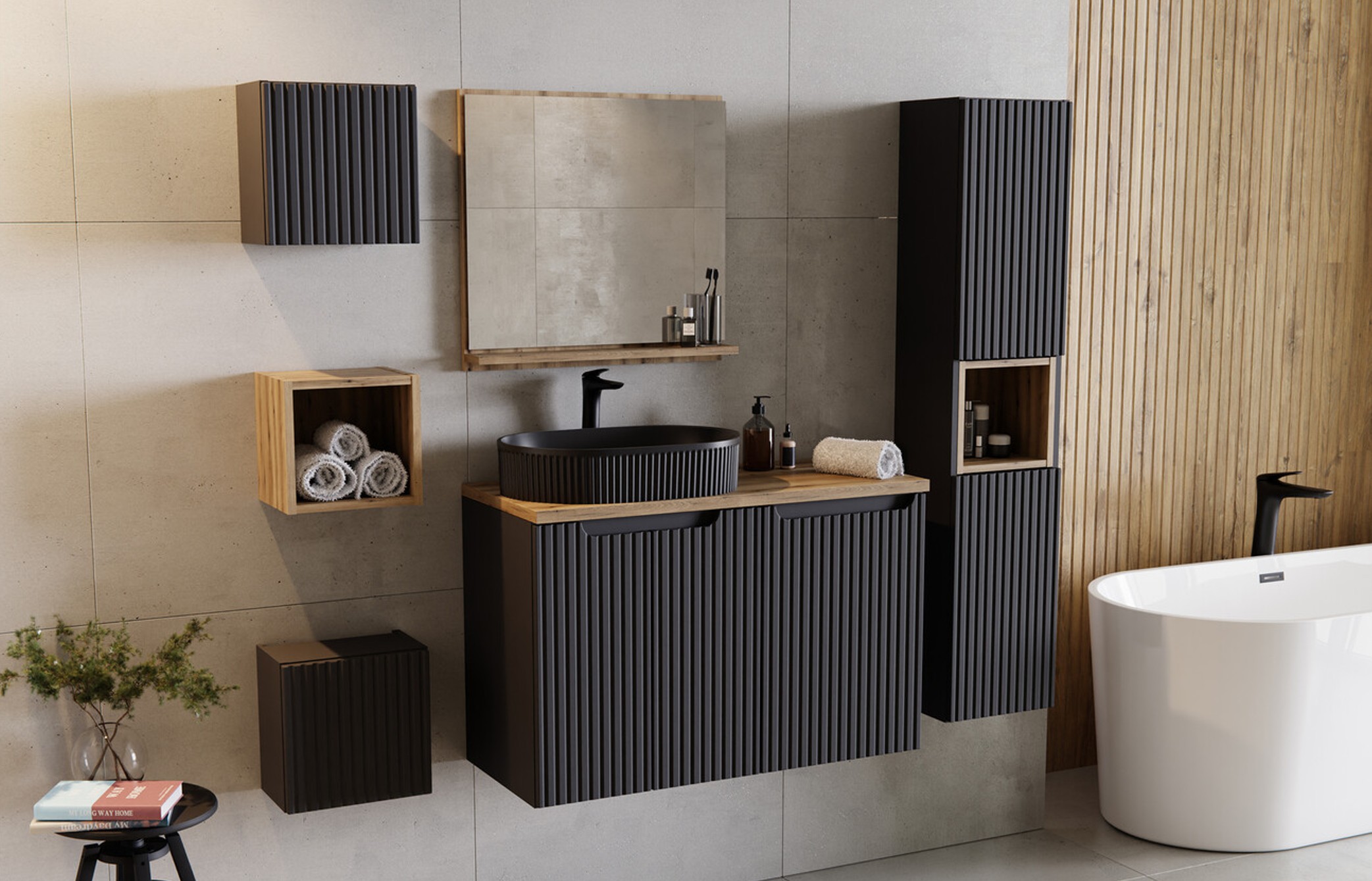 A fekete bútor egy nagyobb térben kifejezetten elegáns, mert nem “nyomja össze” a helyiséget. Sőt, ha jól van megvilágítva, a bordázott textúra még erősebb és prémiumabb hatást ad. Egy ilyen összeállítás valódi fürdőszoba bútor szett élményt nyújt: rendezett, egységes, mégis egyedi.