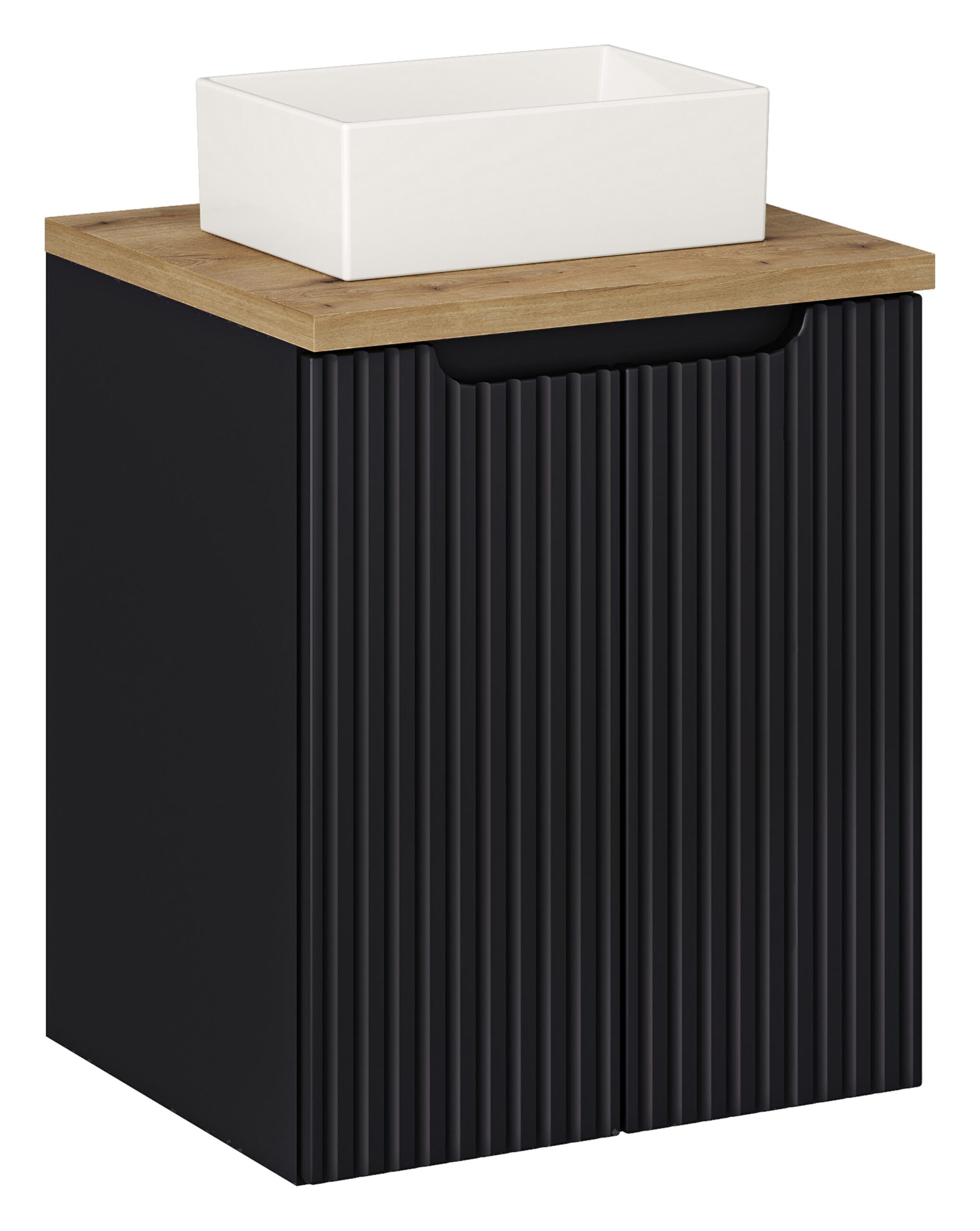 A szett egy tipikus példája lehet egy matt fekete bordázott mosdószekrény és a hozzá illő fa pult kombinációja, amelyet egyes leírások tölgy wotan dekorral említenek. Ez a párosítás kontrasztos, de mégis otthonos: a fekete adja a karaktert, a fa pedig melegíti és “lakályossá” teszi a teret.