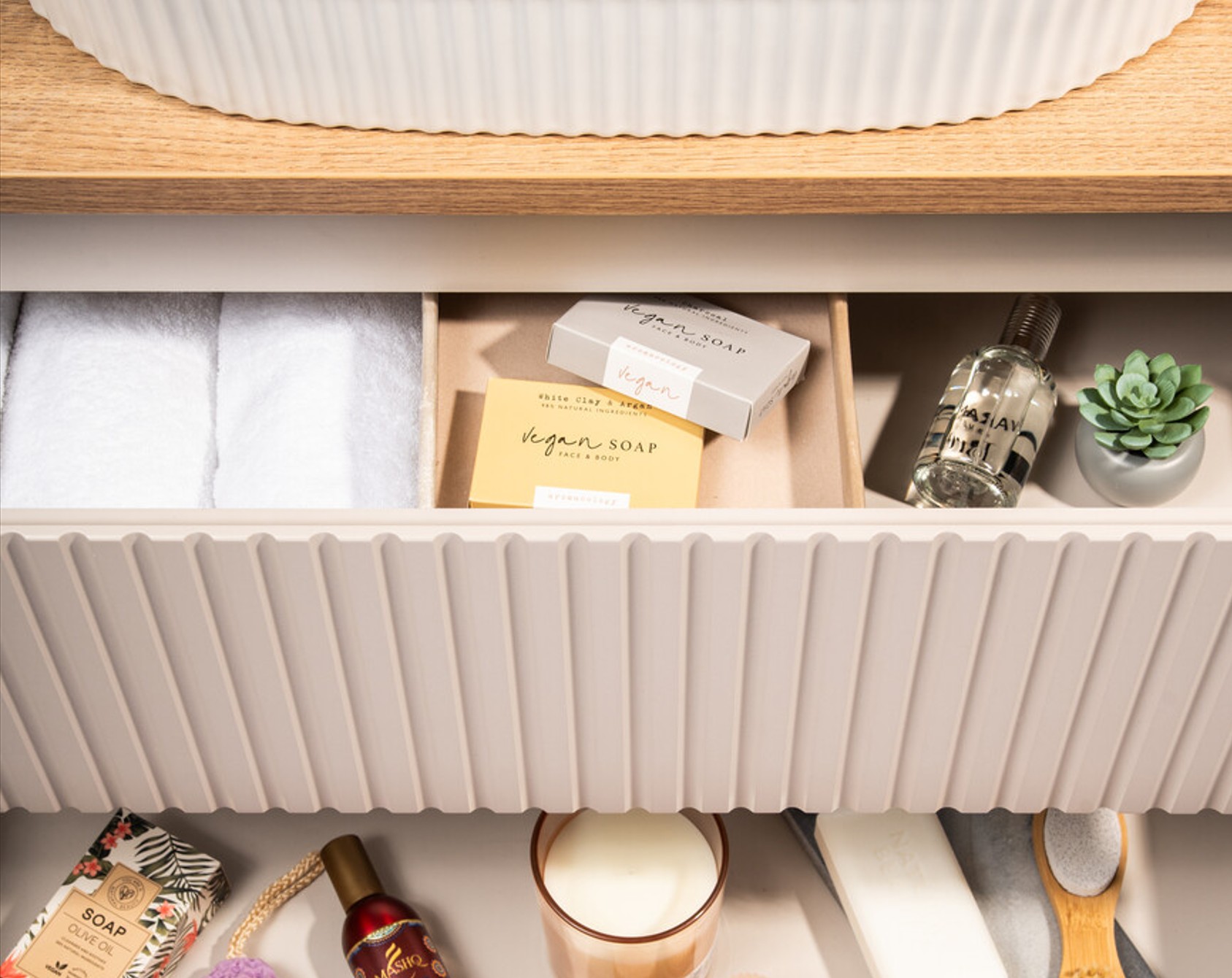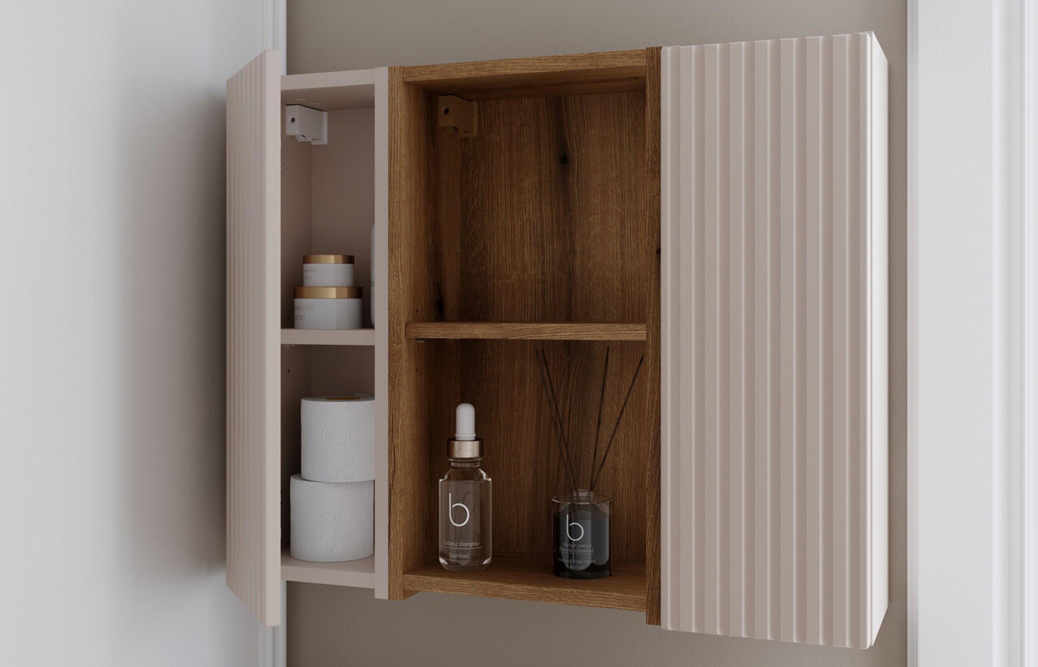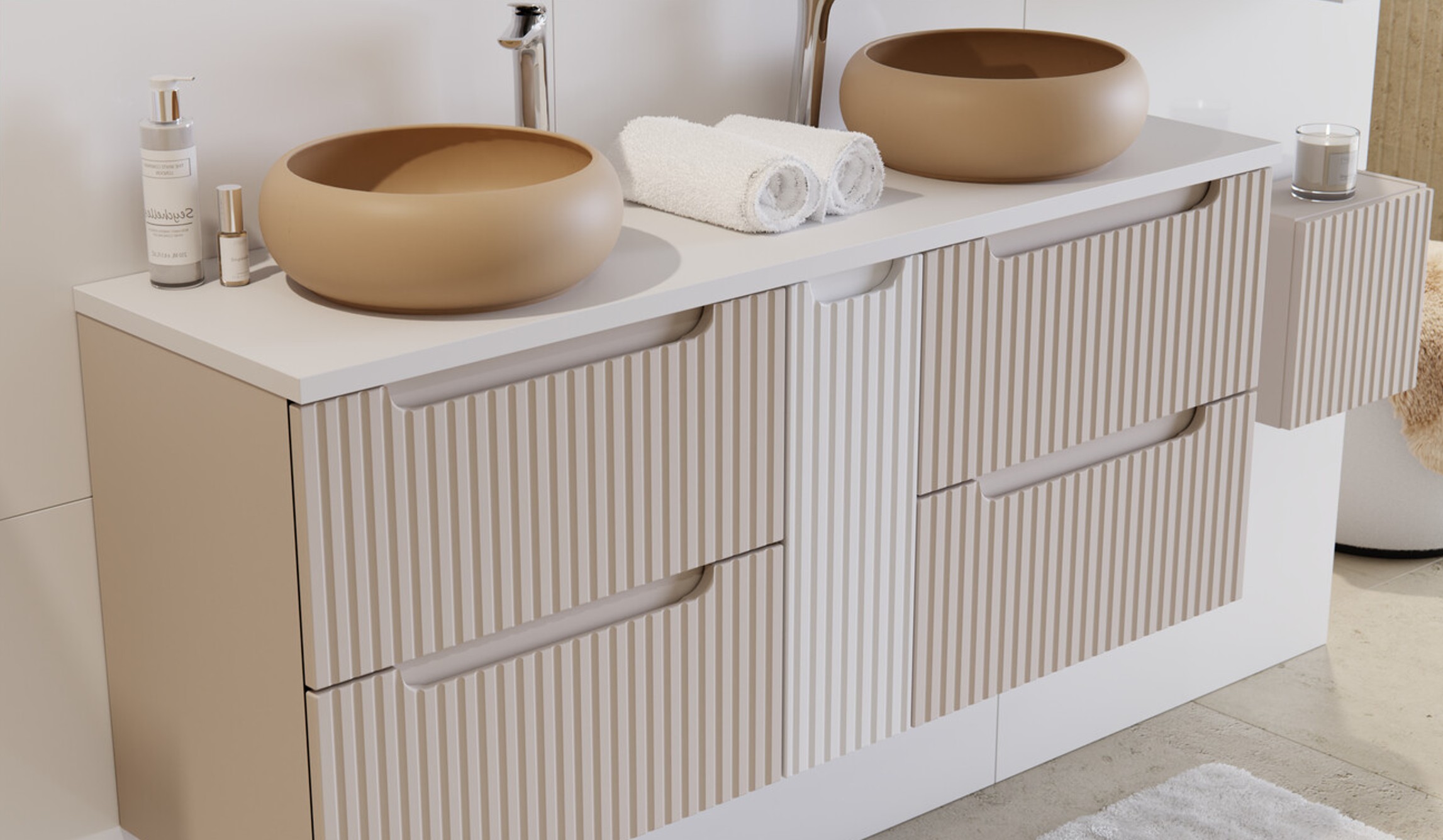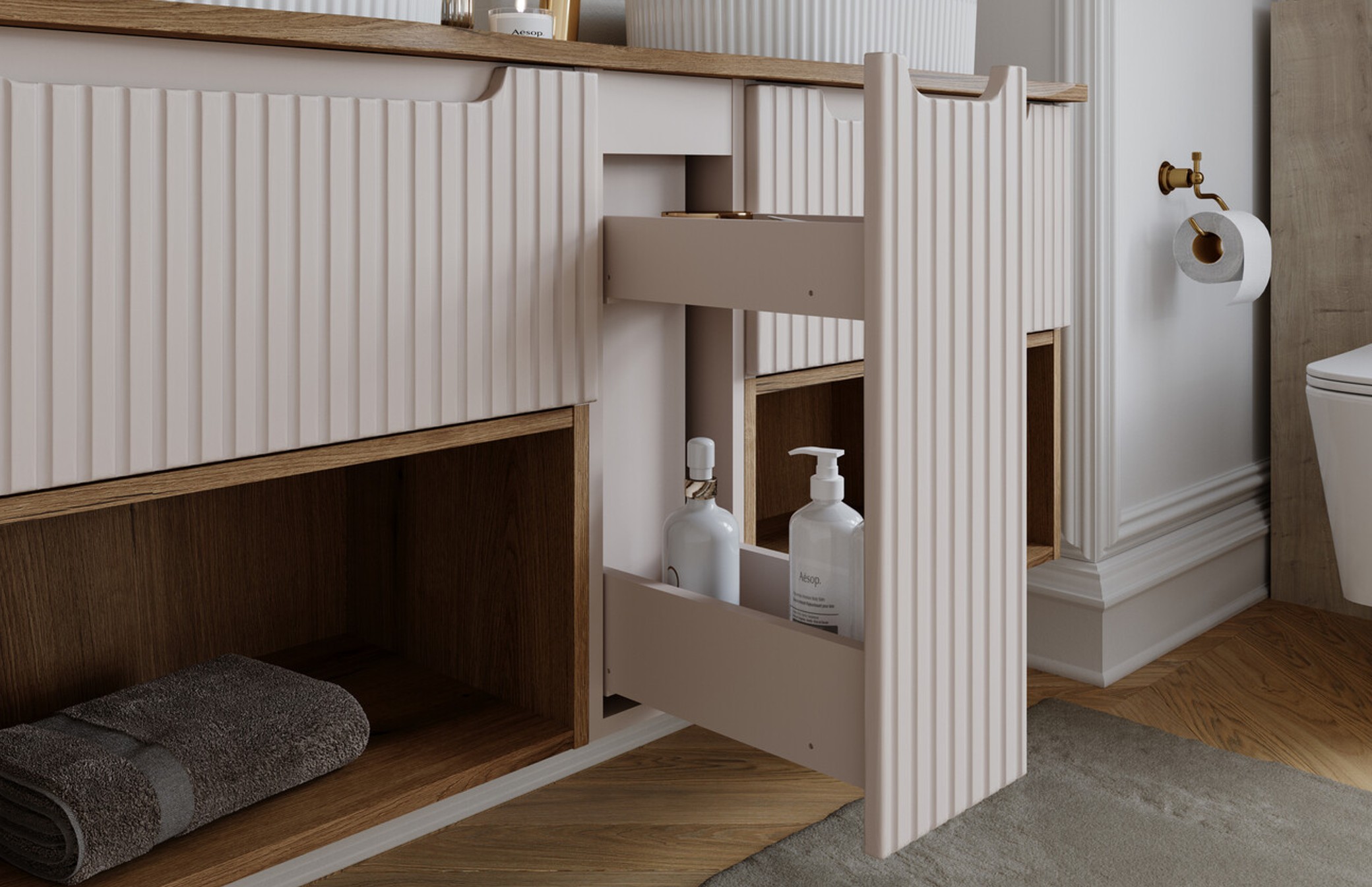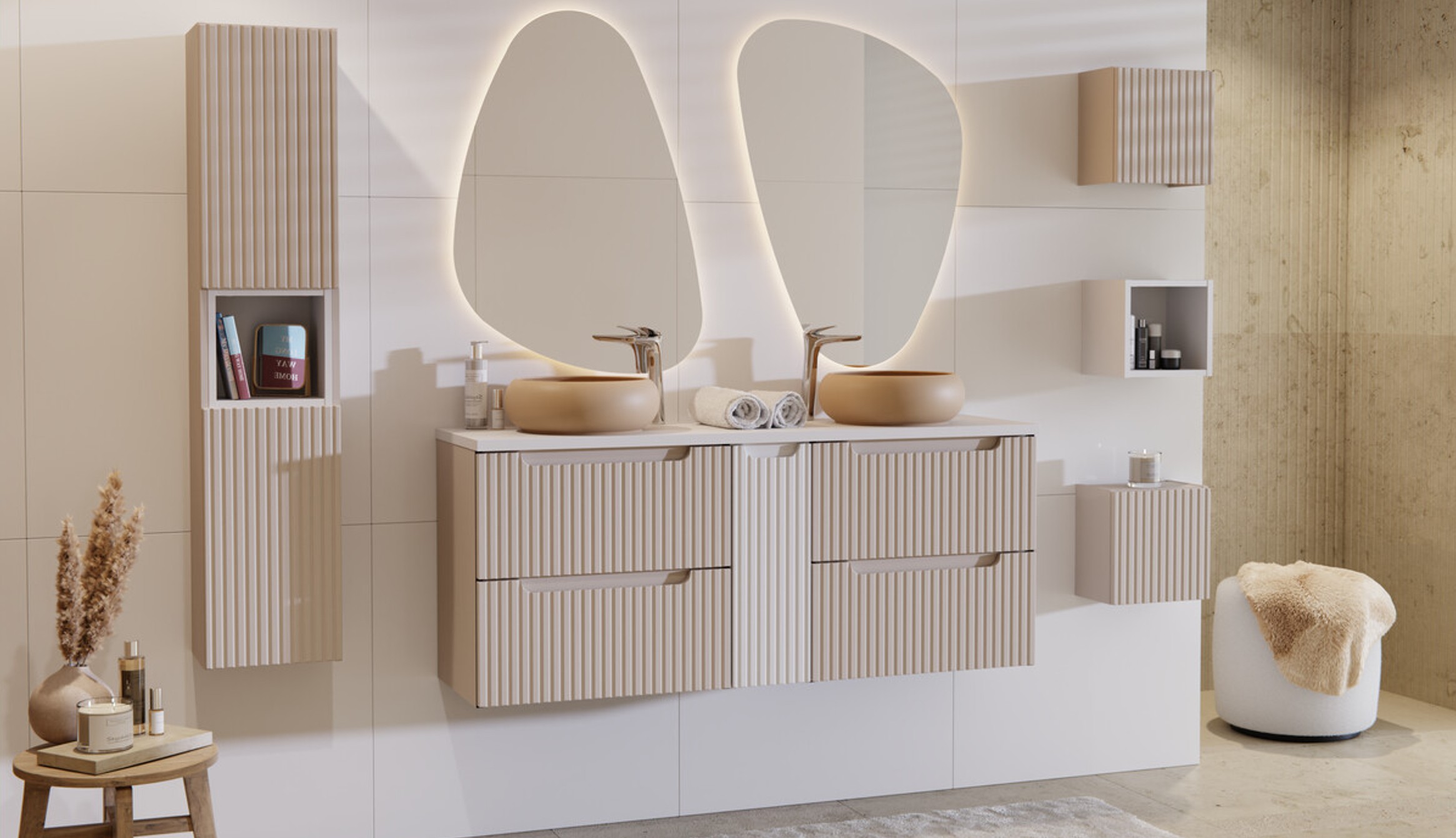 NOVA CASHMERE fürdőszoba bútor kollekció – elegáns kasmír árnyalat, bordázott frontok és átgondolt tárolás