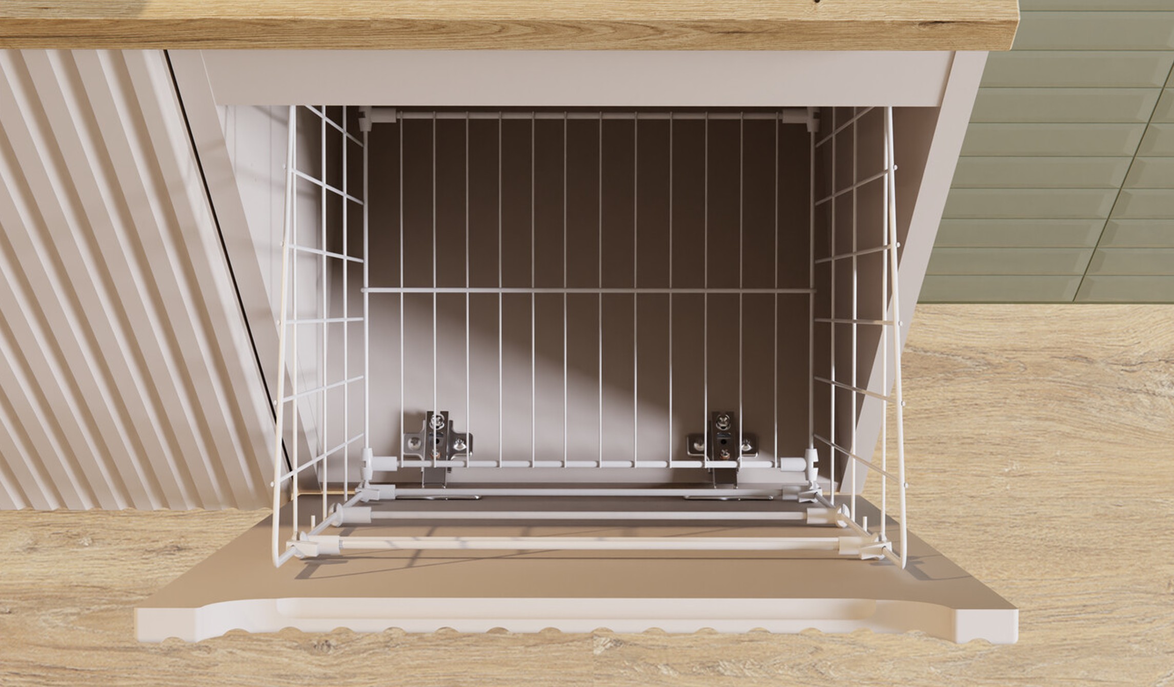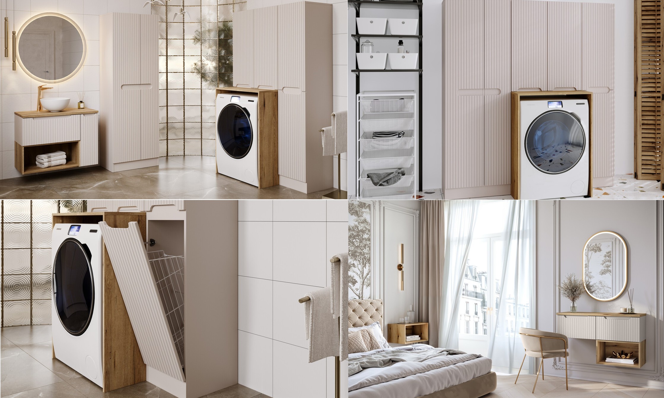 A NOVA CASHMERE kollekció vizuális anyagai alapján jól látható, hogy a rendszer alkalmas mosógép köré szervezett elrendezésre is. Ez nem csak látványos, hanem rendkívül praktikus megoldás: a mosógép körüli tér sokkal rendezettebbé válik, a tisztítószerek, textíliák és szennyes is kulturáltabban tárolható. Egy ilyen kialakítás egy átlagos fürdőszobát is magasabb kategóriába emel vizuálisan.
