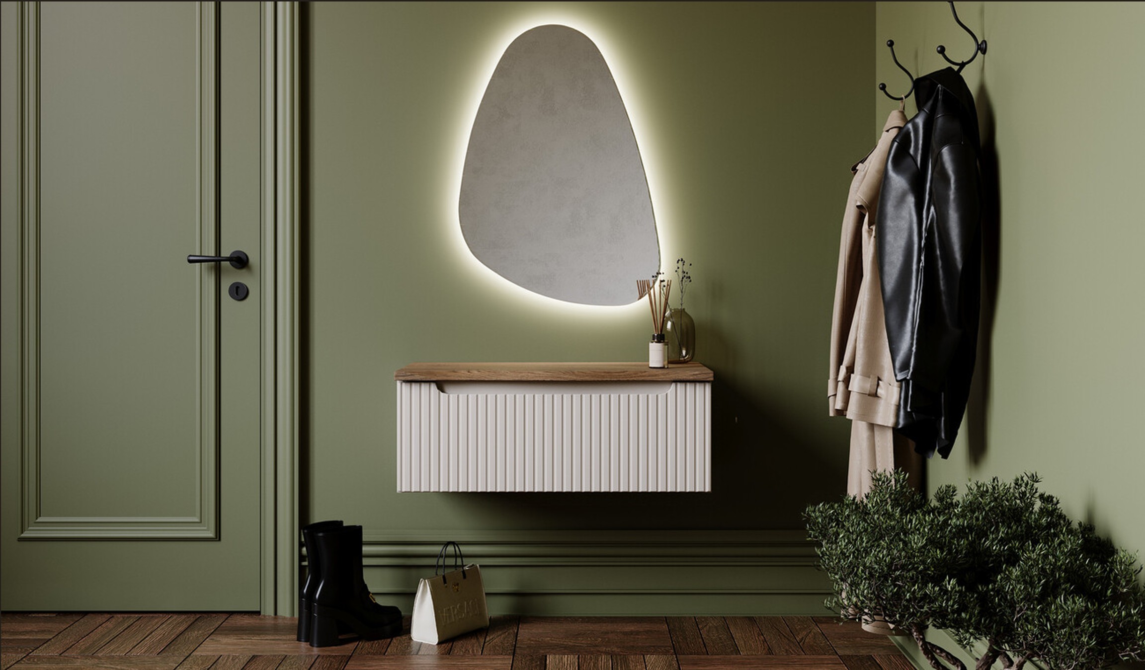 Az összhatás szempontjából sokat számít a tükör és a világítás is. A NOVA CASHMERE különösen jól mutat háttérvilágított tükörrel, ovális vagy lágyan organikus formákkal. A meleg fény szépen kiemeli a bordázott frontok textúráját, a kasmír szín pedig ettől még kellemesebb tónust kap. A megfelelő világítás nem csak esztétikai kérdés, hanem a mindennapi használat kényelmét is javítja.