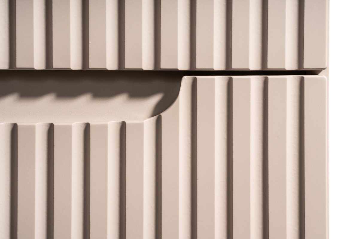 Elegáns, falra szerelhető kialakítás, ritmikus lamellás fronttal. A fiókok praktikus tárolást adnak a napi használatú holmiknak, miközben a tér légies marad.