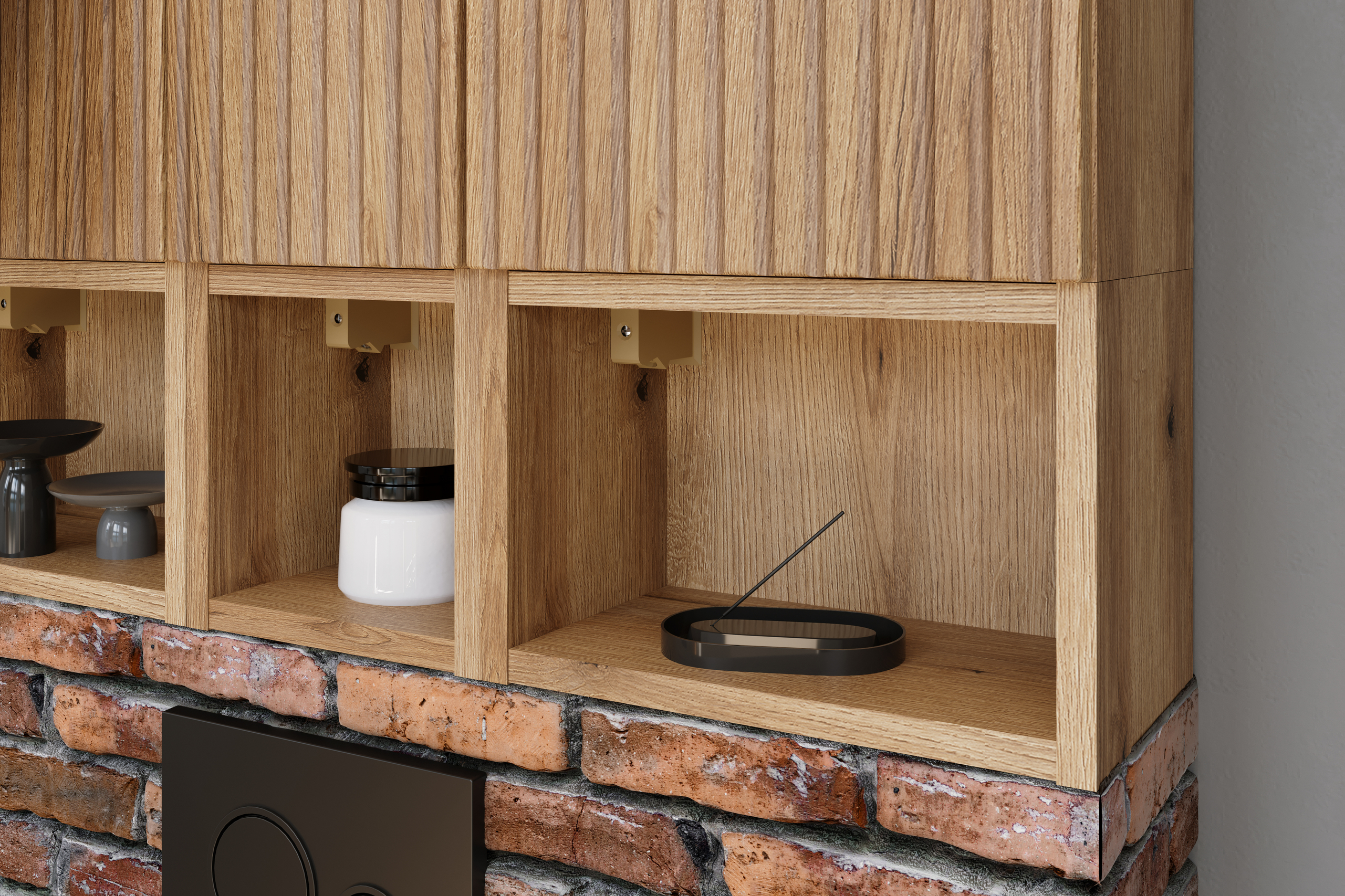 Ez a vizuális egyensúly különösen jól működik olyan enteriőrben, ahol a tulajdonos nem szeretné, hogy a fürdő steril vagy túlságosan hideg legyen. A faerezet sokat segít abban, hogy a tér hívogatóbbnak hasson, a bordázott front pedig egy olyan részlet, amely közelről is látványos marad. Nem véletlen, hogy a részletfotókon is ez az egyik legerősebb elem: a textúra és az élképzés akkor is értéket közvetít, ha a bútor csak kisebb részletben látszik.