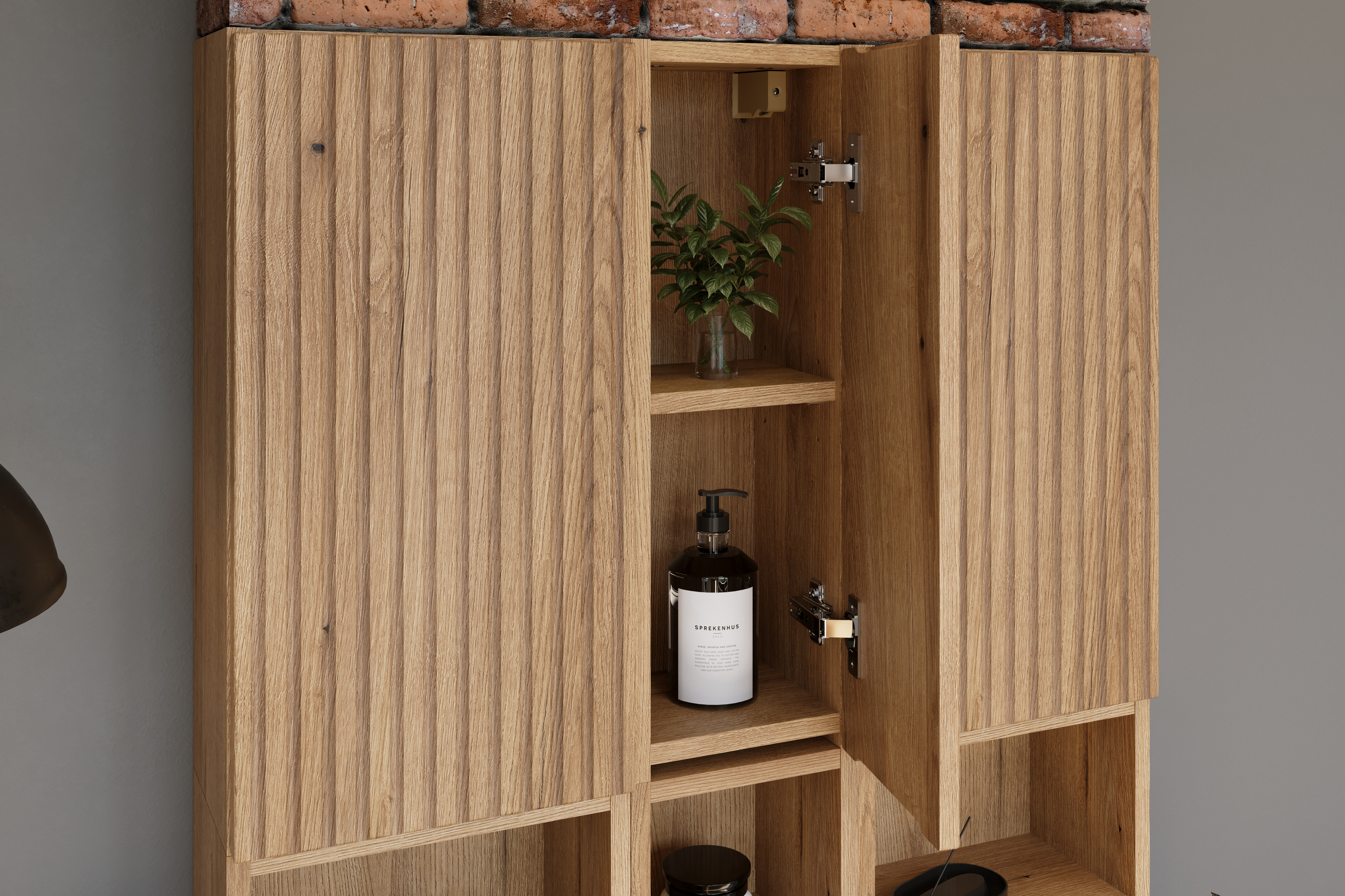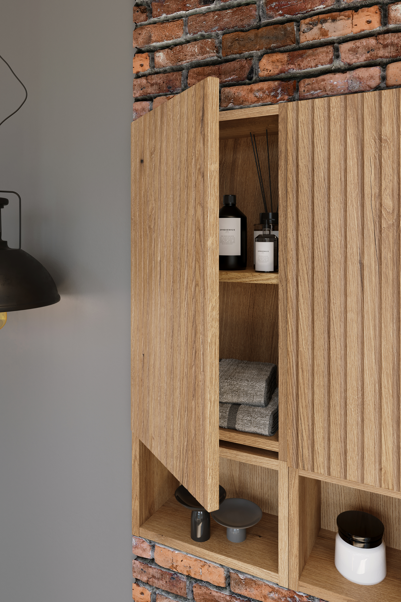Ez a vizuális egyensúly különösen jól működik olyan enteriőrben, ahol a tulajdonos nem szeretné, hogy a fürdő steril vagy túlságosan hideg legyen. A faerezet sokat segít abban, hogy a tér hívogatóbbnak hasson, a bordázott front pedig egy olyan részlet, amely közelről is látványos marad. Nem véletlen, hogy a részletfotókon is ez az egyik legerősebb elem: a textúra és az élképzés akkor is értéket közvetít, ha a bútor csak kisebb részletben látszik.