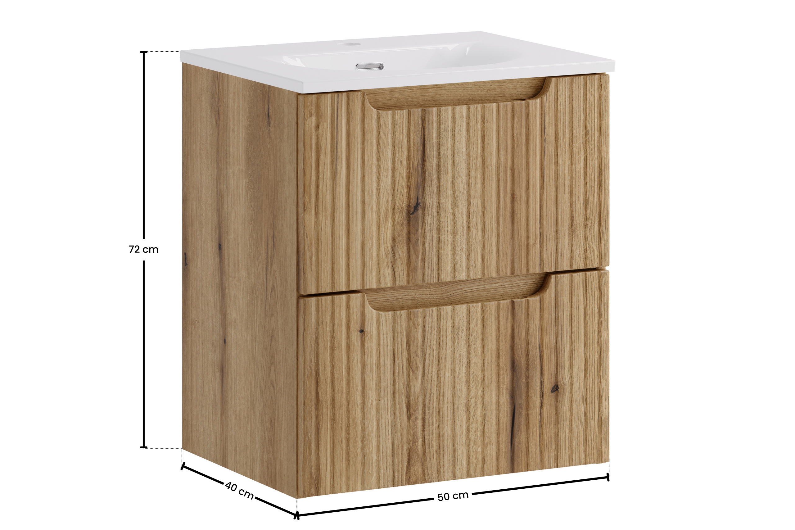 A Nova Coast Evoke egyik legnagyobb erőssége az, hogy a természetes fa megjelenést sokkal frissebb, kortársabb formában mutatja meg, mint a hagyományos fabútorok. A bordázott frontok játékot és textúrát visznek a felületbe, ezért a bútor akkor is izgalmas marad, ha a helyiség egyébként egyszerűbb burkolatot vagy visszafogottabb dekorációt kap. Ez különösen fontos egy modern fürdőszoba bútor esetében, mert a mai vásárlók gyakran szeretnének egyensúlyt a funkcionalitás és a karakteres megjelenés között.