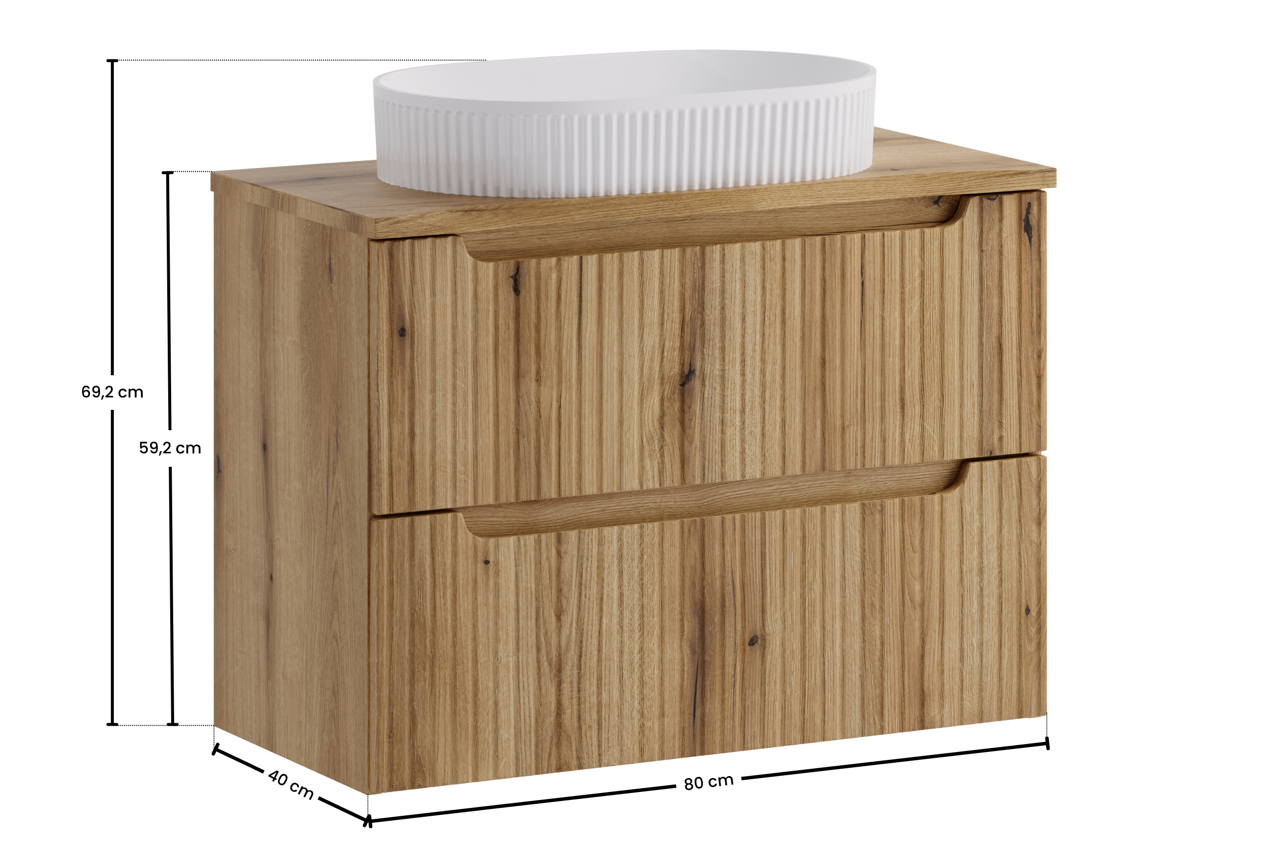 A Nova Coast Evoke egyik legnagyobb erőssége az, hogy a természetes fa megjelenést sokkal frissebb, kortársabb formában mutatja meg, mint a hagyományos fabútorok. A bordázott frontok játékot és textúrát visznek a felületbe, ezért a bútor akkor is izgalmas marad, ha a helyiség egyébként egyszerűbb burkolatot vagy visszafogottabb dekorációt kap. Ez különösen fontos egy modern fürdőszoba bútor esetében, mert a mai vásárlók gyakran szeretnének egyensúlyt a funkcionalitás és a karakteres megjelenés között.