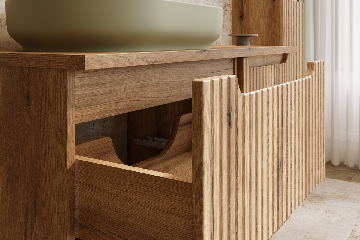 Elegáns, falra szerelhető kialakítás, ritmikus lamellás fronttal. A fiókok praktikus tárolást adnak a napi használatú holmiknak, miközben a tér légies marad.