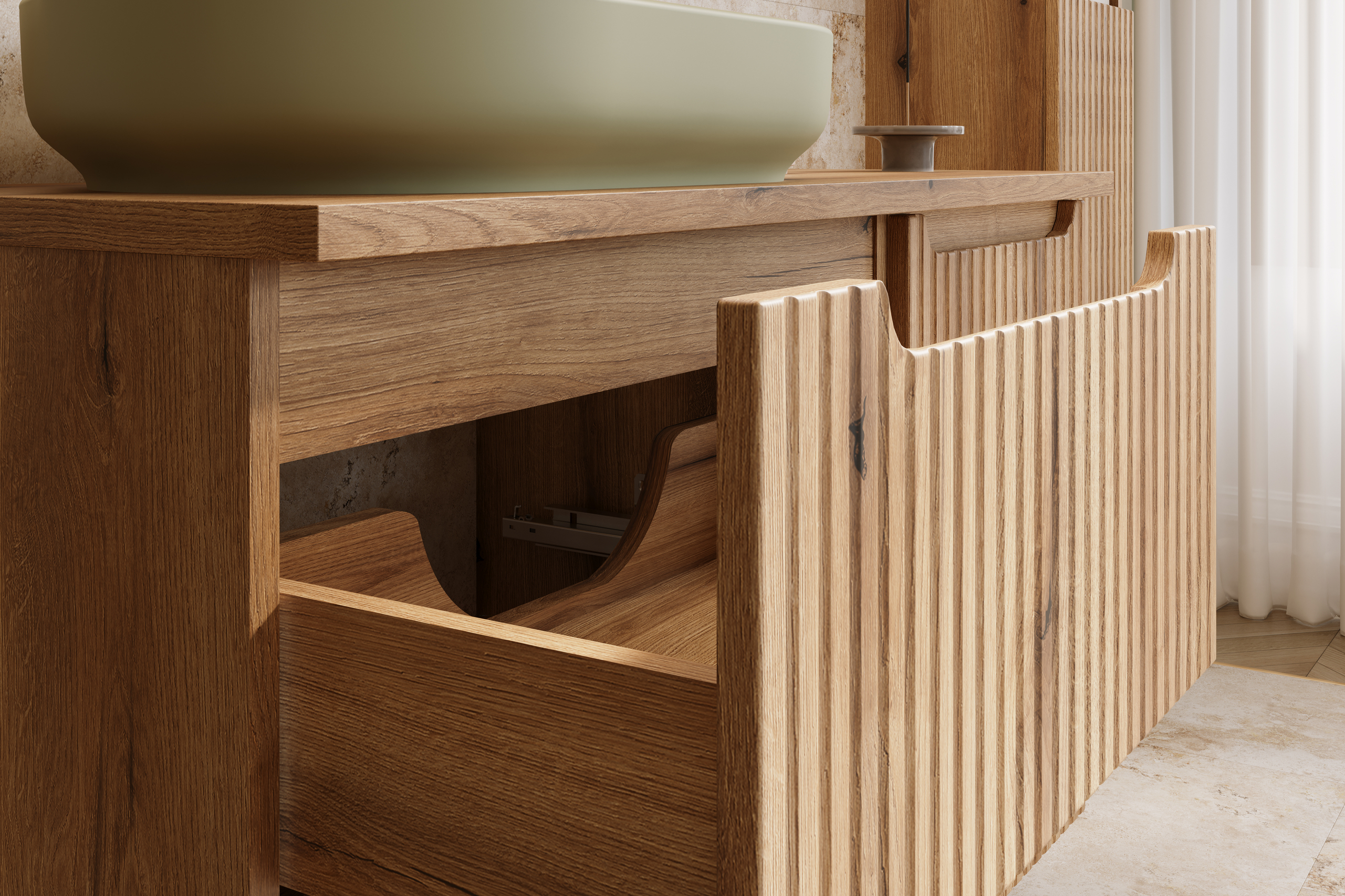 Ez a vizuális egyensúly különösen jól működik olyan enteriőrben, ahol a tulajdonos nem szeretné, hogy a fürdő steril vagy túlságosan hideg legyen. A faerezet sokat segít abban, hogy a tér hívogatóbbnak hasson, a bordázott front pedig egy olyan részlet, amely közelről is látványos marad. Nem véletlen, hogy a részletfotókon is ez az egyik legerősebb elem: a textúra és az élképzés akkor is értéket közvetít, ha a bútor csak kisebb részletben látszik.
